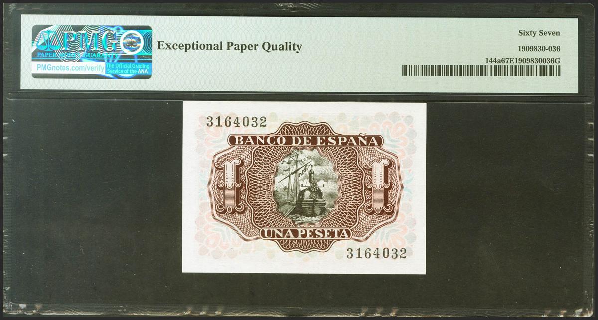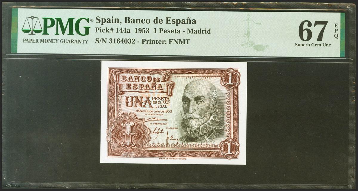 1 Peseta. 22 de Julio de 1953. Sin serie. (Edifil 2021: 465, Pick: 144a). Raro en esta excepcional calidad. SC. Encapsulado PMG67EPQ.