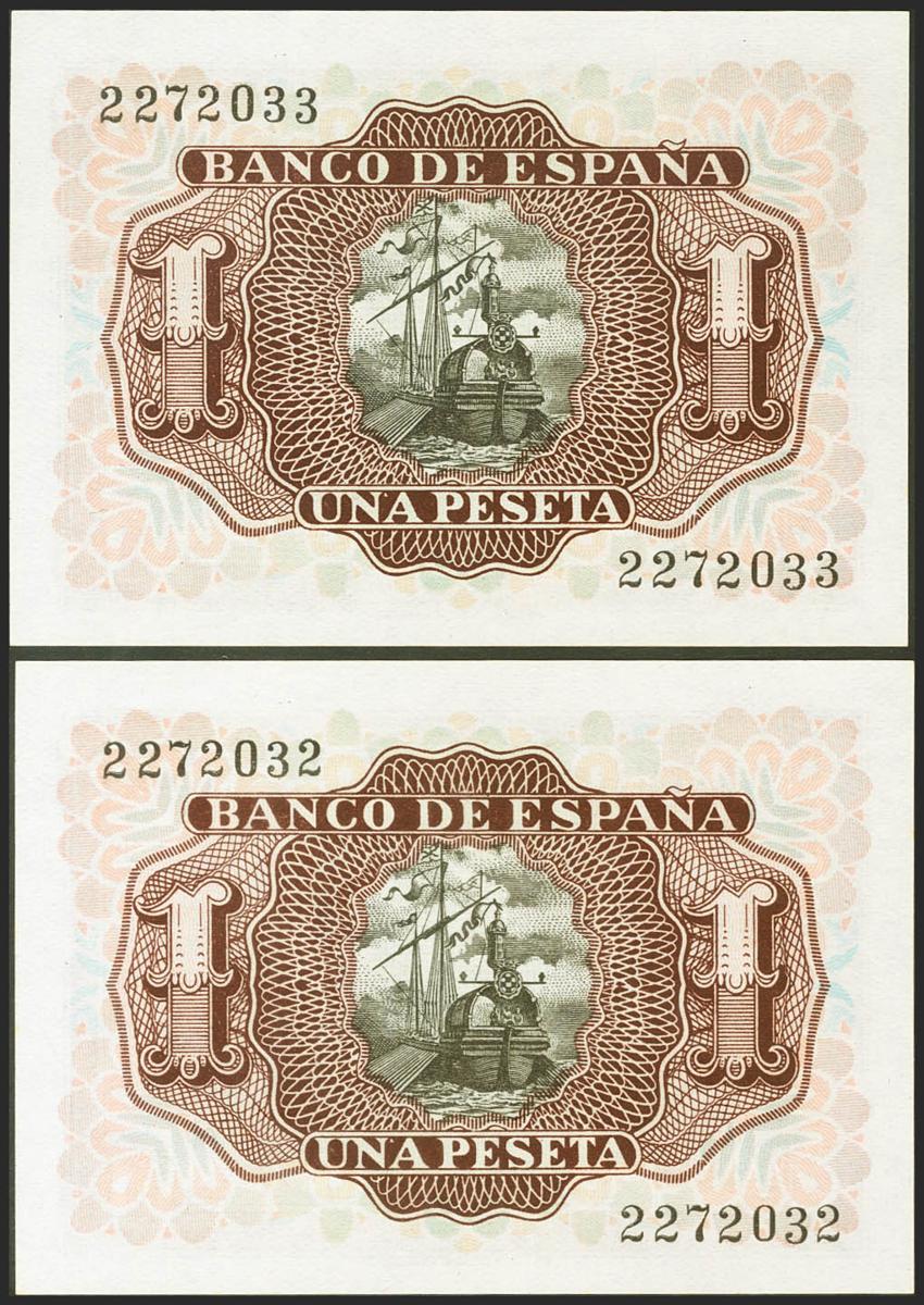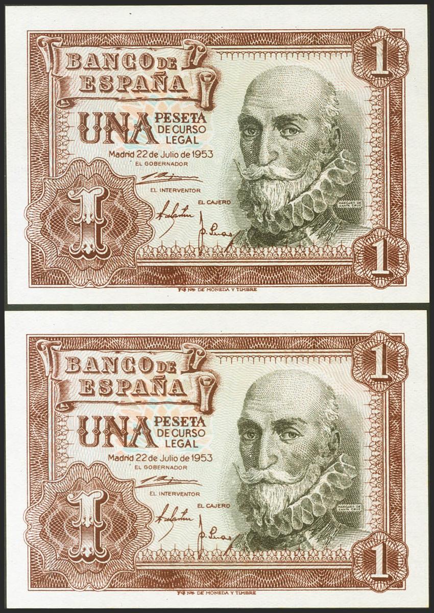 1 Peseta. 22 de Julio de 1953. Pareja correlativa. Sin serie. (Edifil 2021: 465). Apresto original. SC.
