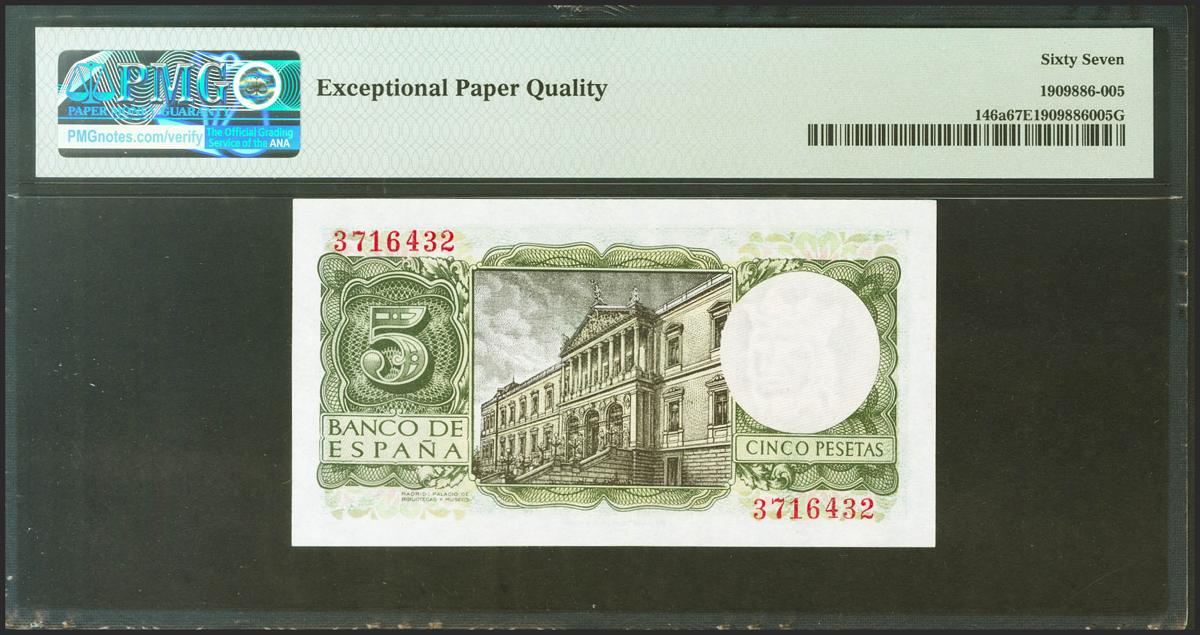 5 Pesetas. 22 de Julio de 1954. Sin serie. (Edifil 2021: 466, Pick: 146a). Raro en esta excepcional calidad, apresto original. SC. Encapsulado PMG67EPQ.