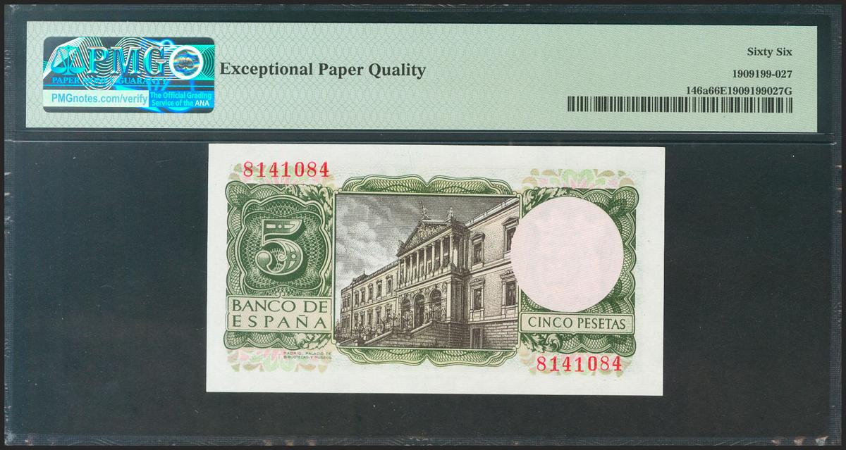 5 Pesetas. 22 de Julio de 1954. Sin serie. (Edifil 2021: 466, Pick: 146a). Raro en esta calidad, apresto original. SC. Encapsulado PMG66EPQ.
