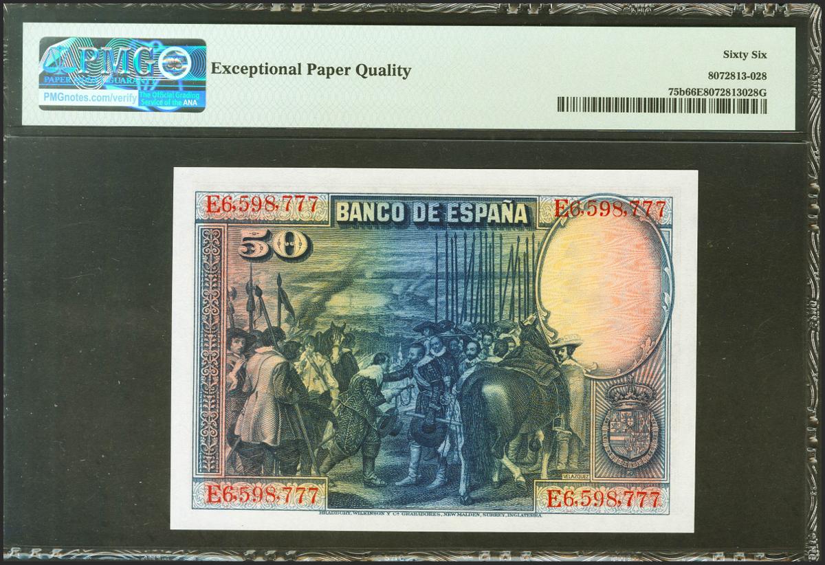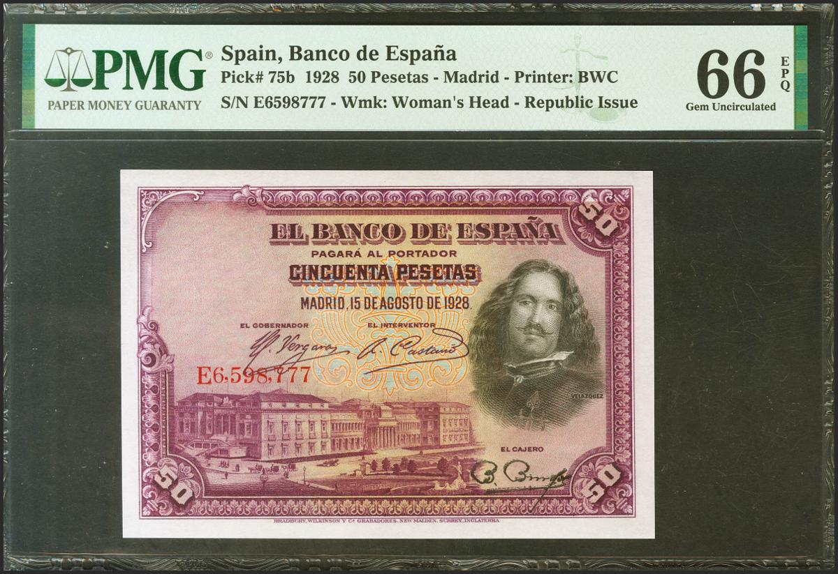 50 Pesetas. 15 de Agosto de 1928. Serie E. (Edifil 2021: 354, Pick: 75b). Apresto original. Encapsulado PMG66EPQ.