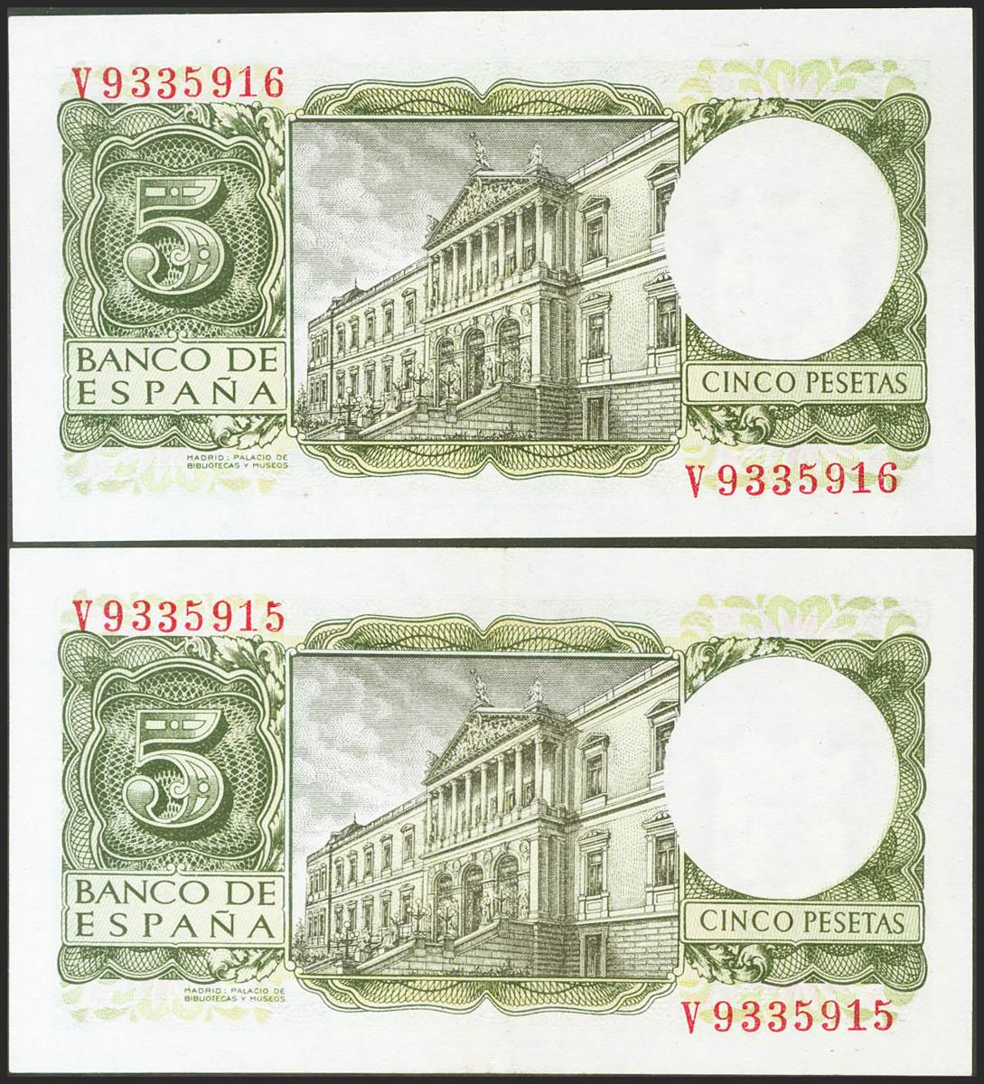 5 Pesetas. 22 de Julio de 1954. Pareja correlativa. Serie V. (Edifil 2021: 466a). Conserva todo su apresto original. EBC+.