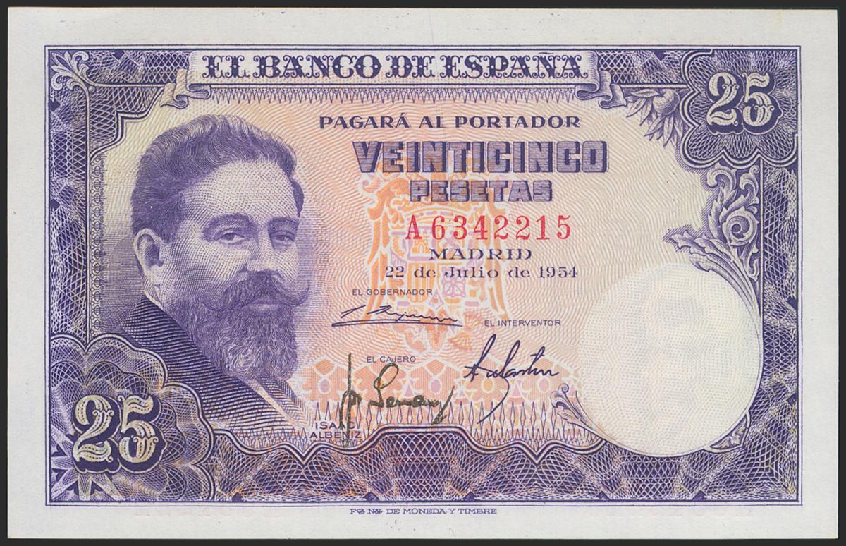 25 Pesetas. 22 de Julio de 1954. Serie A. (Edifil 2021: 467a). Apresto original. SC.