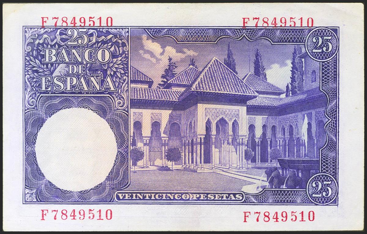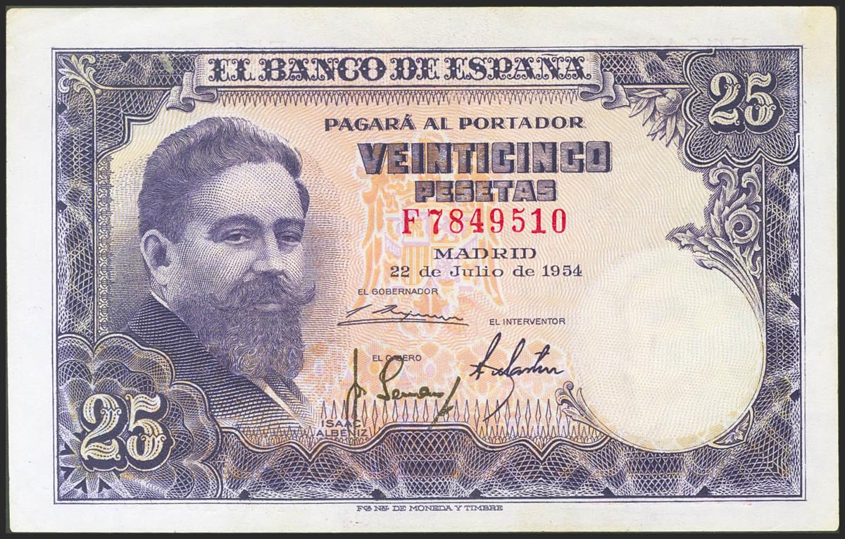 25 Pesetas. 22 de Julio de 1954. Serie F. (Edifil 2021: 467a). Apresto original. SC--.