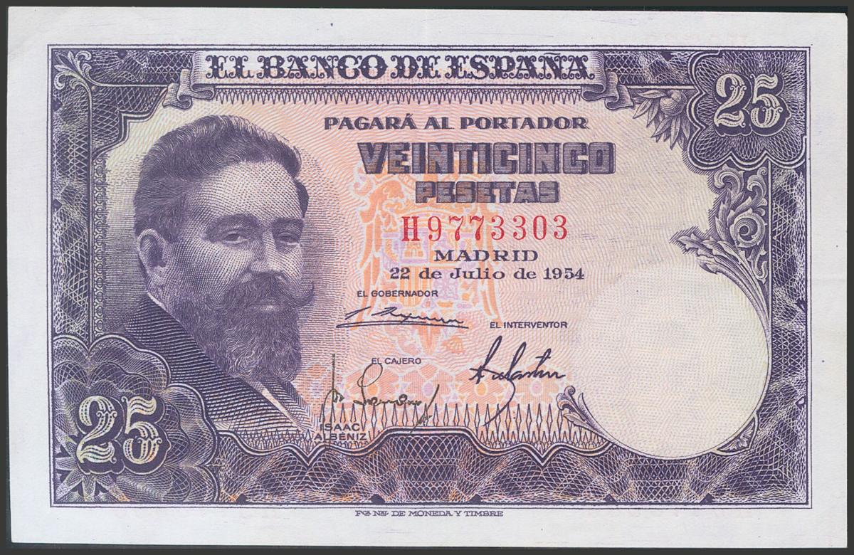 25 Pesetas. 22 de Julio de 1954. Serie H. (Edifil 2017: 467a). Conserva parte del apresto original. EBC-.