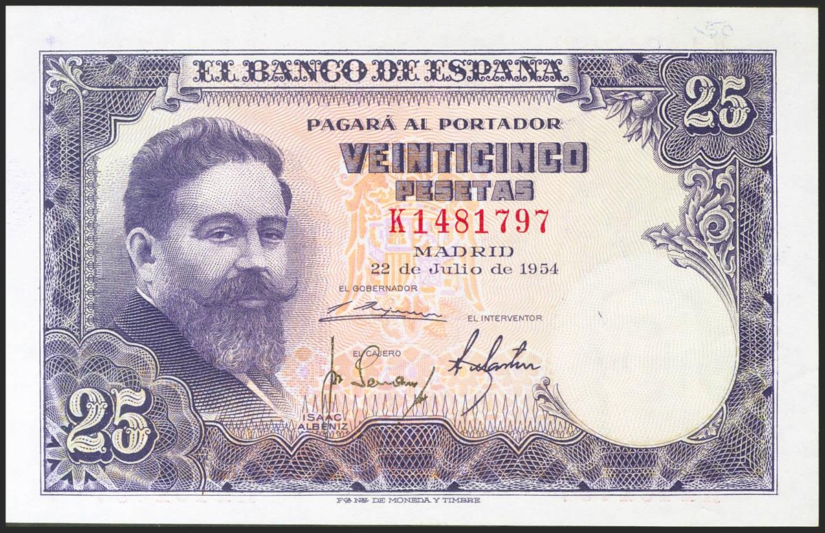 25 Pesetas. 22 de Julio de 1954. Serie K. (Edifil 2021: 467a). Conserva gran parte del apresto original. EBC+.