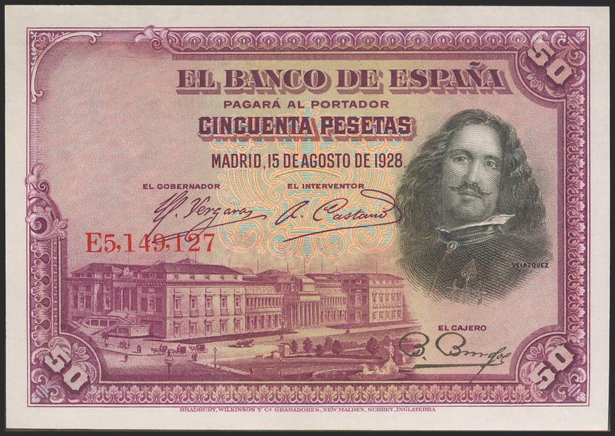 50 Pesetas. 15 de Agosto de 1928. Serie E. (Edifil 2021: 354). Apresto original. SC.