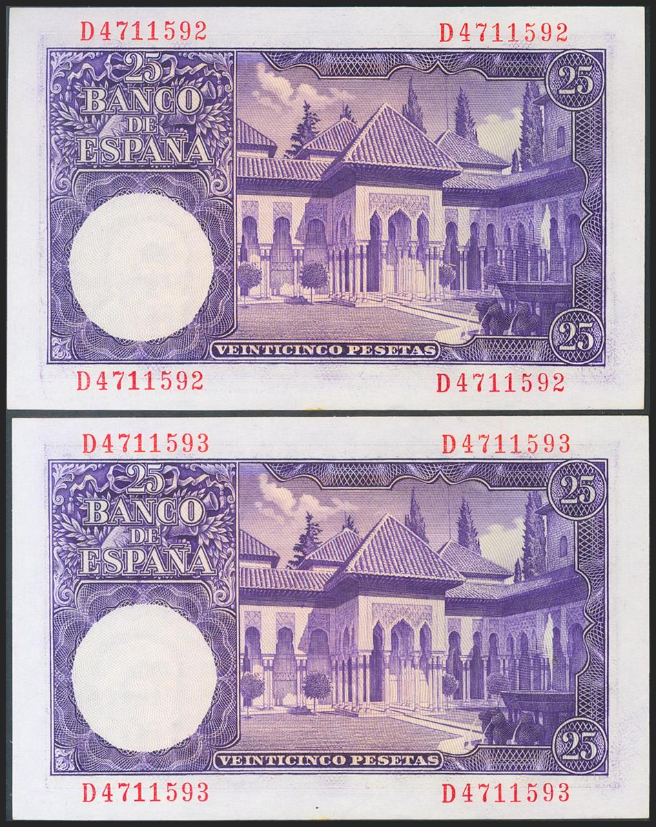 25 Pesetas. 22 de Julio de 1954. Pareja correlativa. Serie D. (Edifil 2021: 467a). Apresto original, manchita de óxido en el margen inferior. SC-/EBC+.