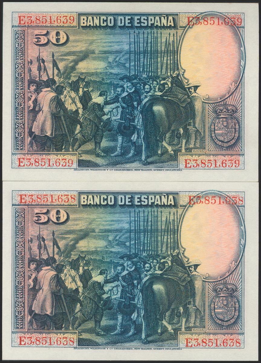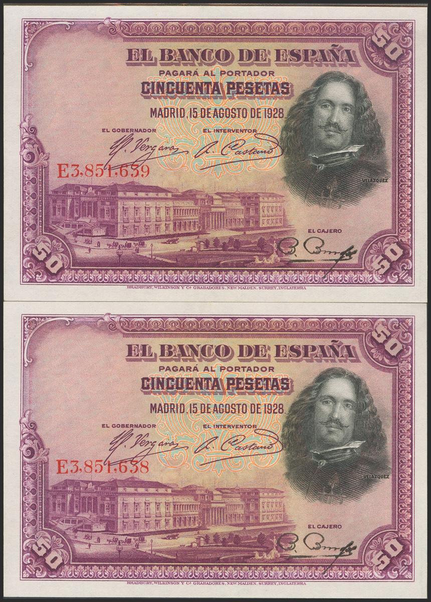 50 Pesetas. 15 de Agosto de 1928. Pareja correlativa. Serie E. (Edifil 2021: 354). Conserva gran parte del apresto original. EBC+.
