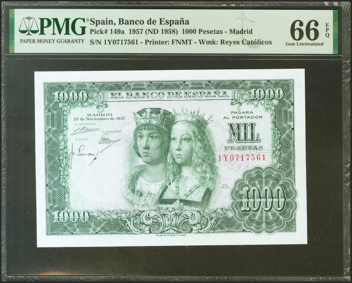 1000 Pesetas. 29 de Noviembre de 1957. Serie 1Y, última serie emitida. (Edifil 2021: 469b, Pick: 149a). Raro en esta excepcional calidad, apresto original. SC. Encapsulado PMG66EPQ.