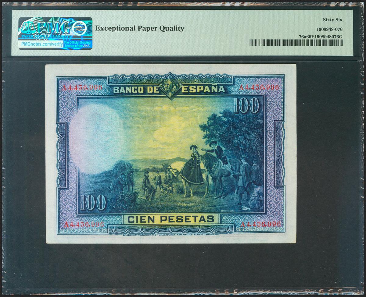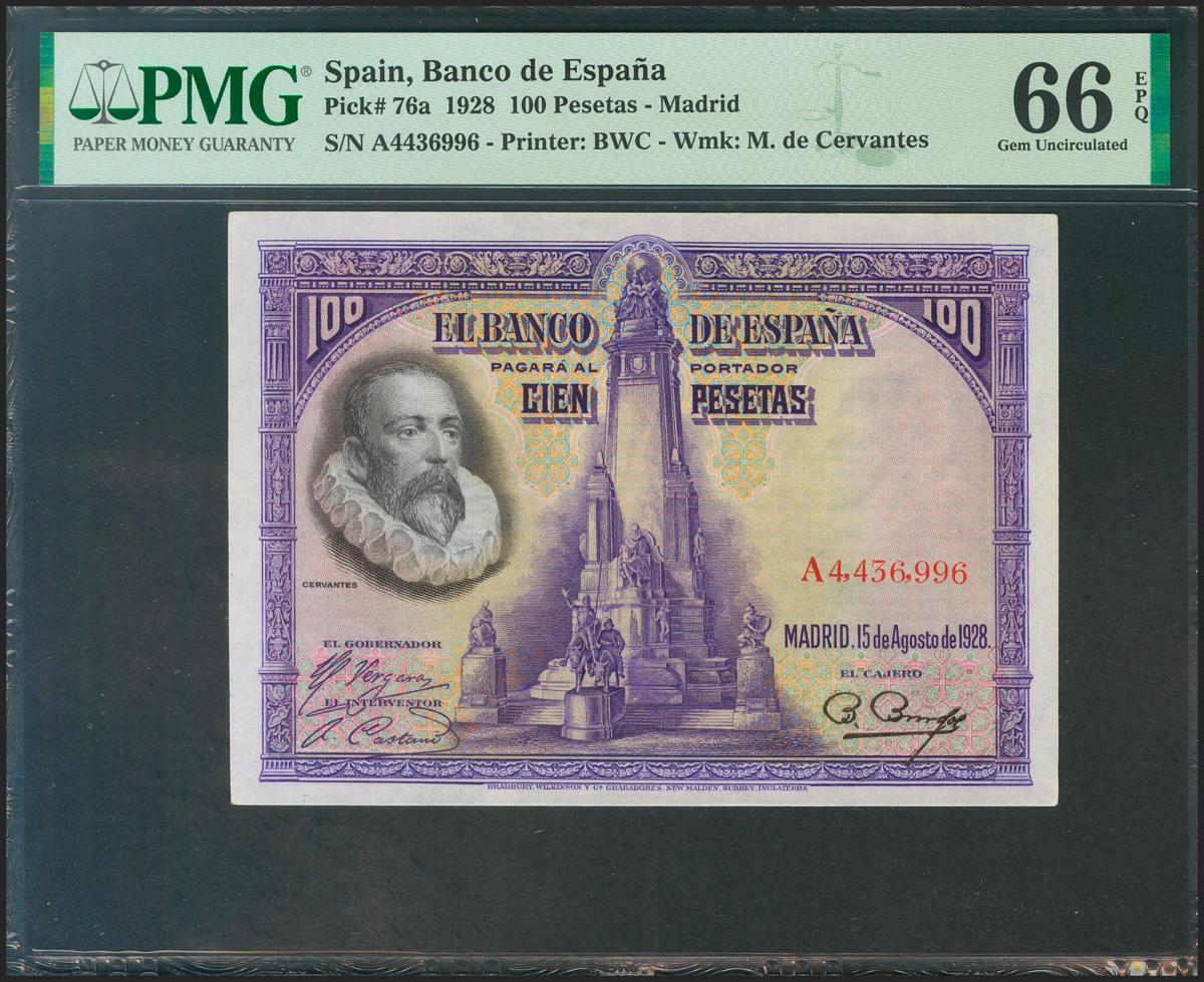 100 Pesetas. 15 de Agosto de 1928. Serie A. (Edifil 2021: 355a, Pick: 76a). Raro en esta calidad y con apresto original. SC. Encapsulado PMG66EPQ.