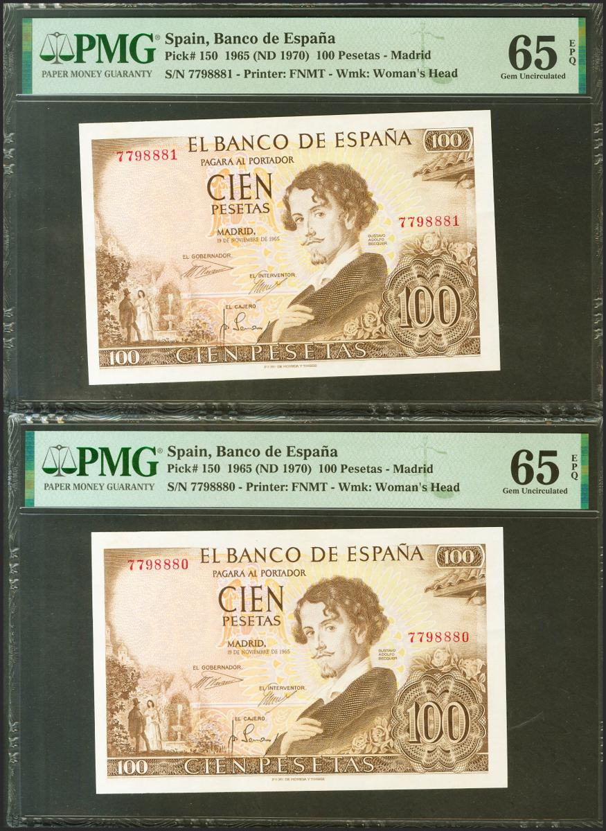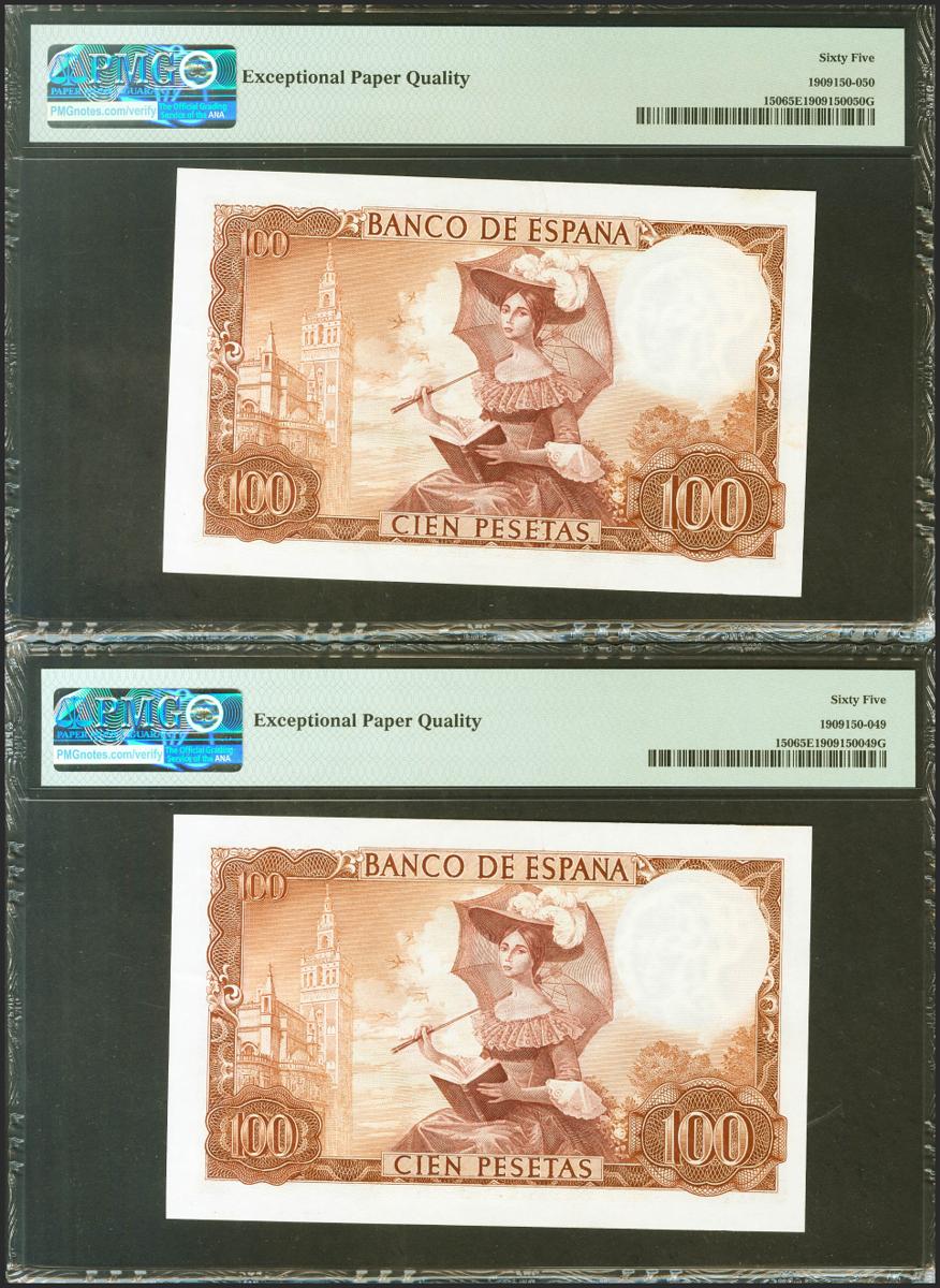 100 Pesetas. 19 de Noviembre de 1965. Pareja correlativa. Sin serie. (Edifil 2021: 470, Pick: 150). Apresto original. Encapsulados PMG65EPQ, ambos.