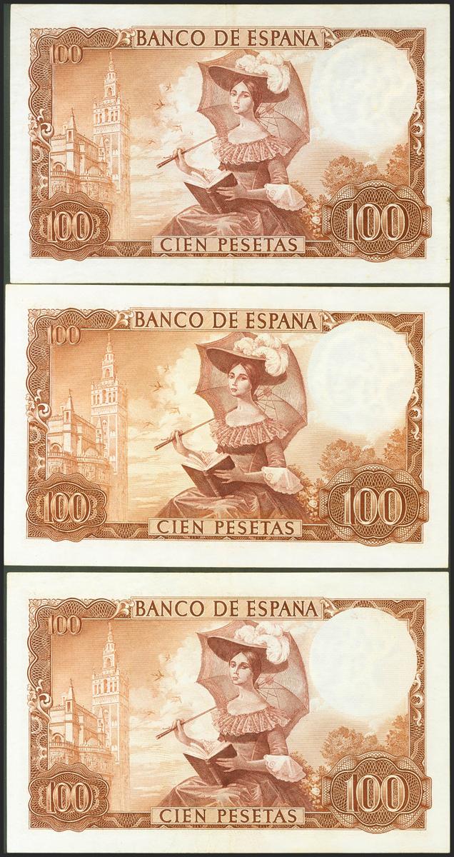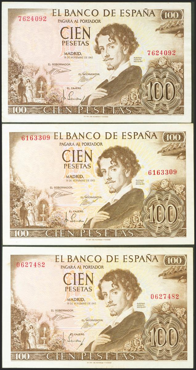 Conjunto de 3 billetes de 100 Pesetas emitidos el 19 de Noviembre de 1965, todos sin serie (Edifil 2021: 470). EBC/EBC-.