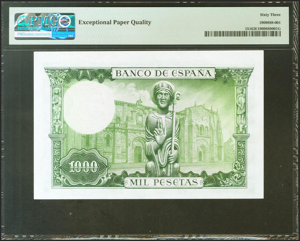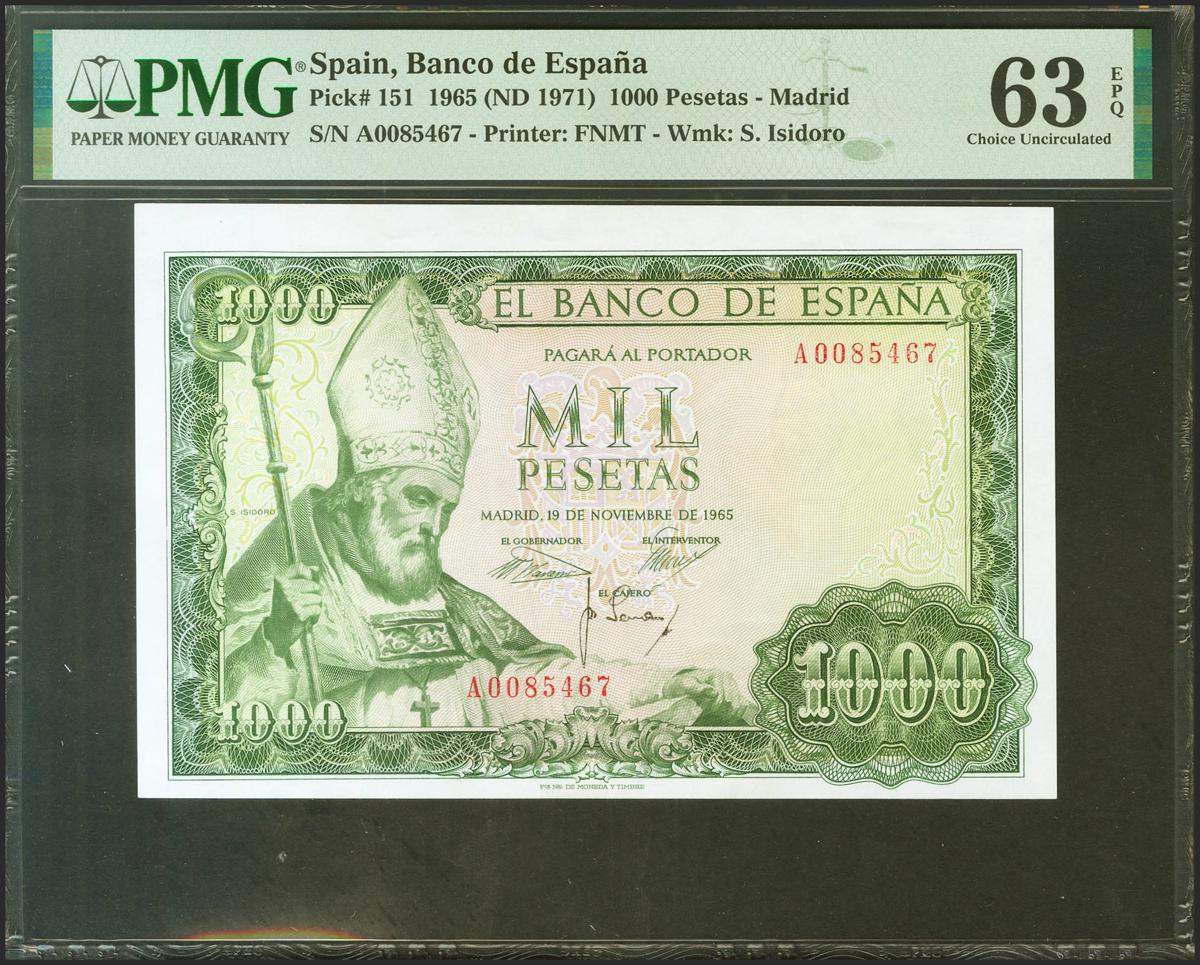 1000 Pesetas. 19 de Noviembre de 1965. Serie A. (Edifil 2021: 471a, Pick: 151). Inusual serie, apresto original. SC. Encapsulado PMG63EPQ.