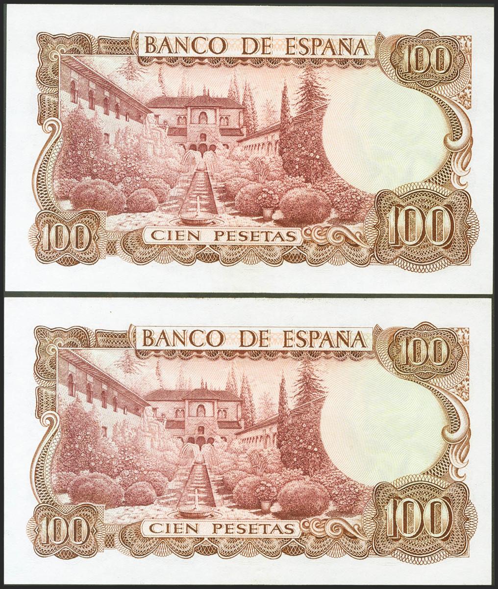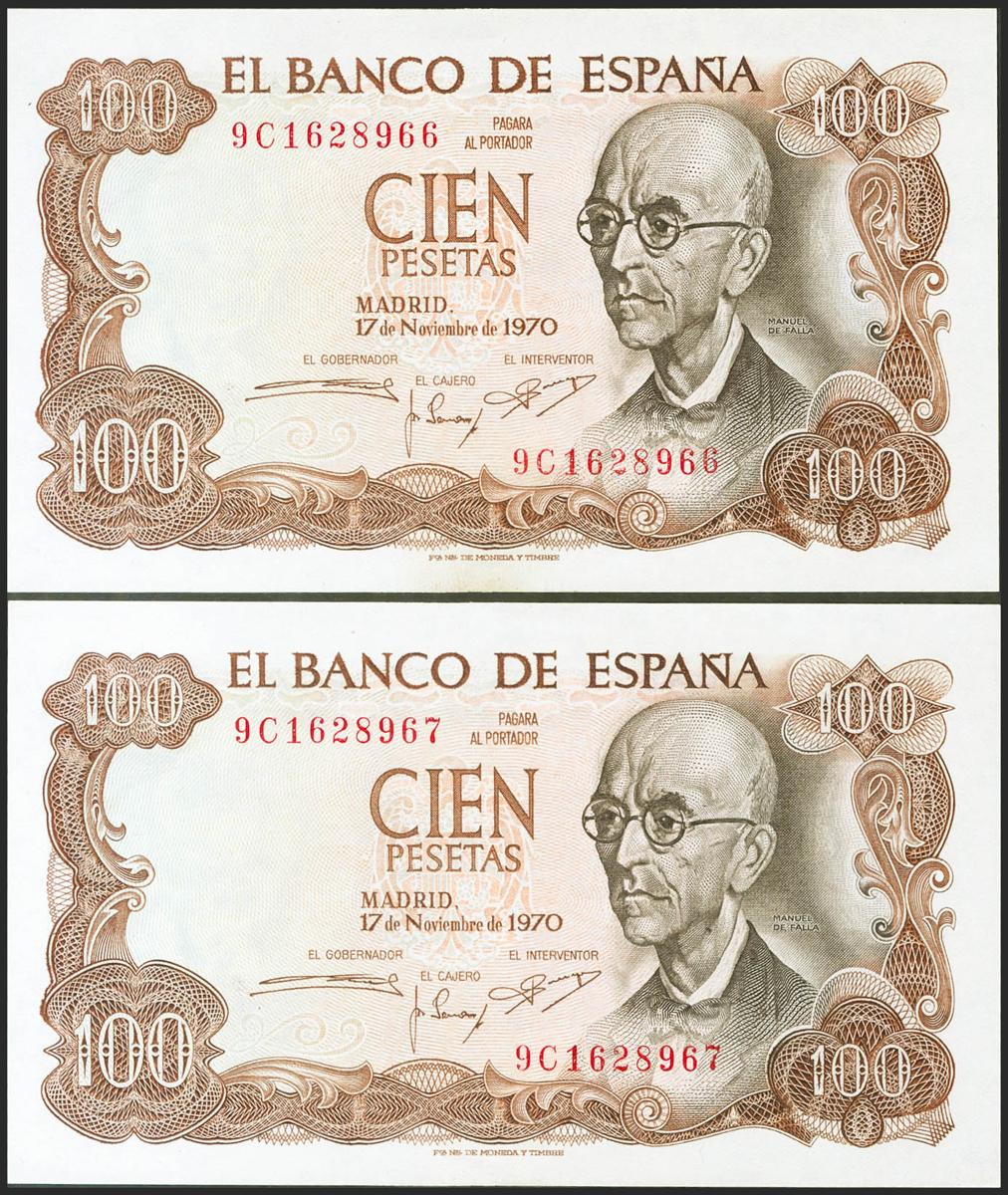 100 Pesetas. 17 de Noviembre de 1970. Pareja correlativa. Serie 9C. (Edifil 2021: 472d). Apresto original. SC.