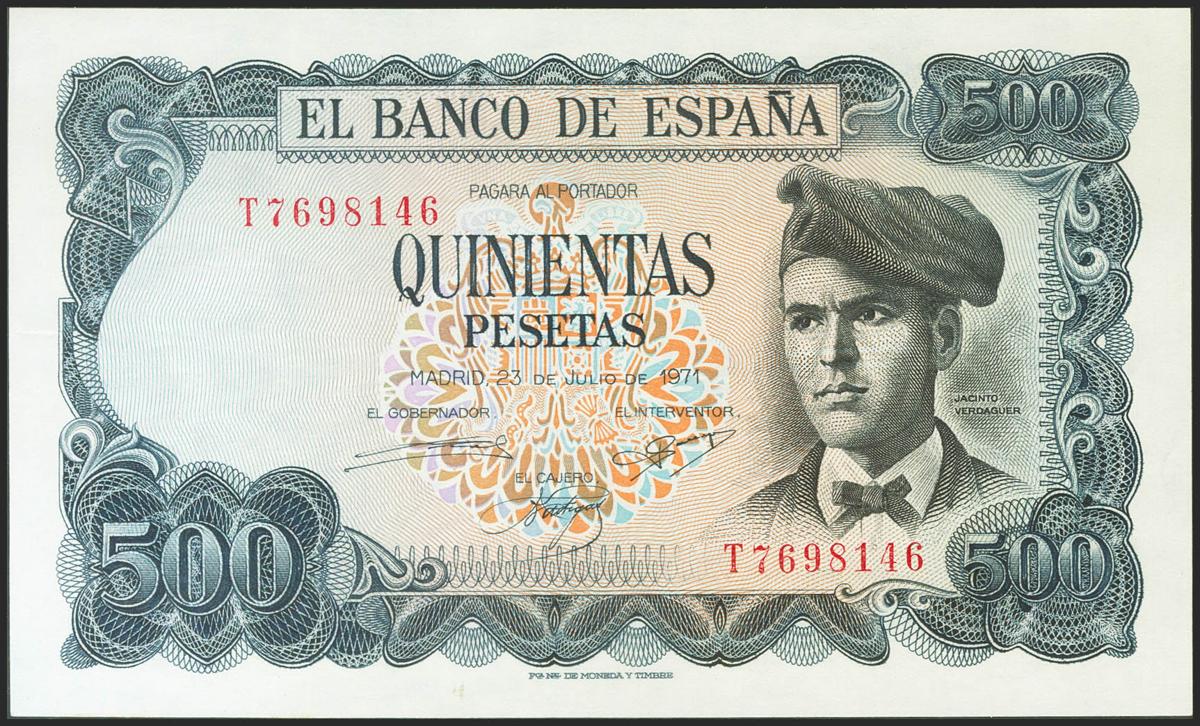 500 Pesetas. 23 de Julio de 1971. Serie T. (Edifil 2021: 473a). Conserva todo su apresto original. SC-.