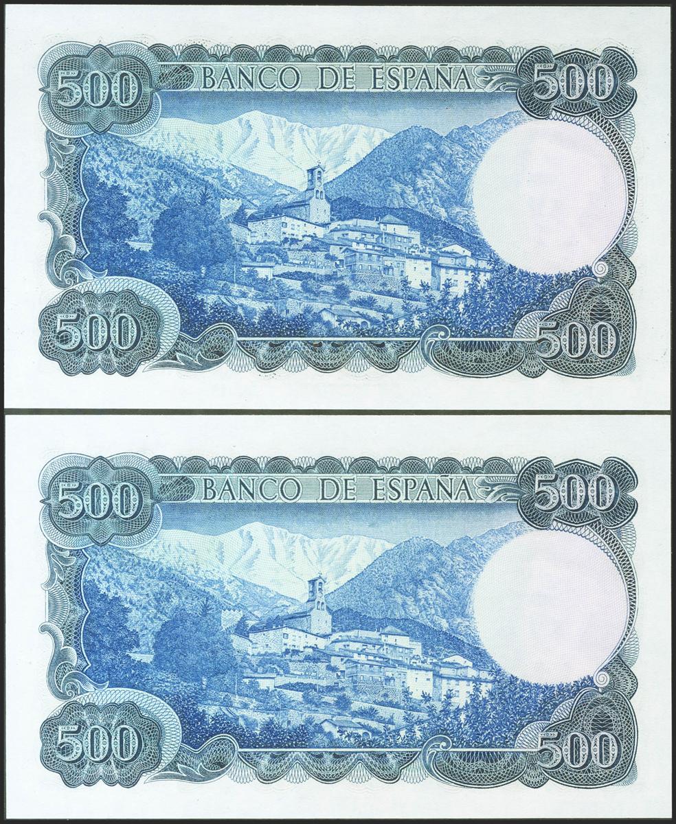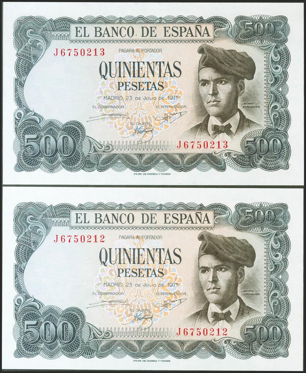 500 Pesetas. 23 de Julio de 1971. Pareja correlativa. Serie J. (Edifil 2021: 473a). Apresto original. SC.