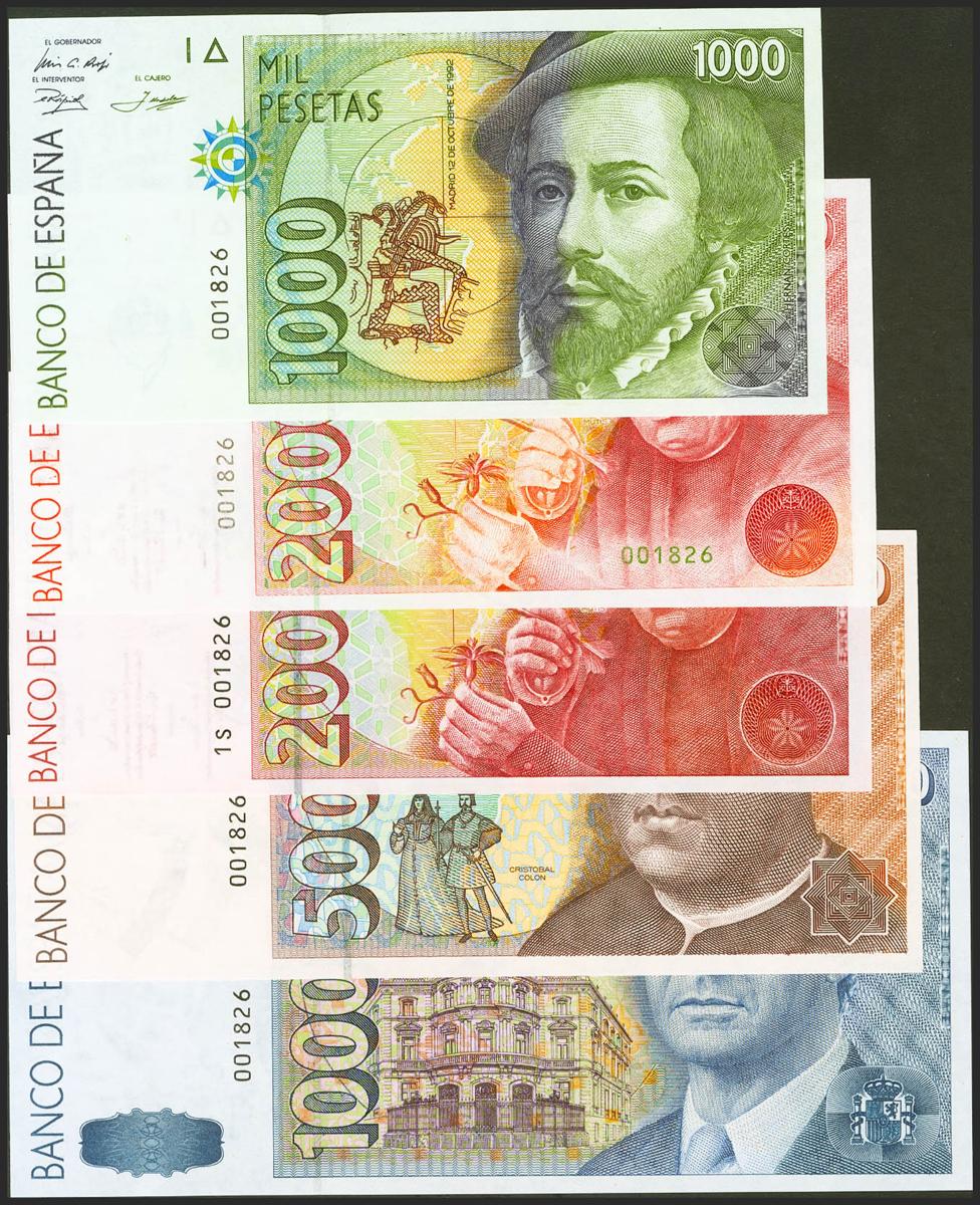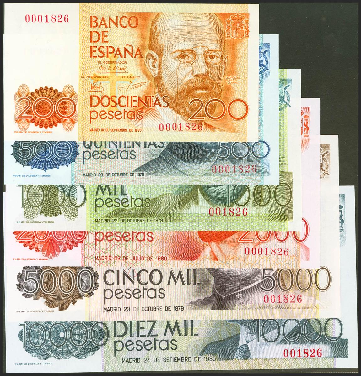 Conjunto de 6 billetes de 200 Pesetas, 500 Pesetas, 1000 Pesetas, 2000 Pesetas, 5000 Pesetas y 10000 Pesetas, todos los billetes emitidos entre 1979 y 1985, todos sin serie y con la misma baja numeración 0001826, además la serie completa de 5 billetes de la emisión de 1992 (incluyendo el de 2000 Pesetas de 1995 con la serie 1S), todos sin serie y con la misma numeración baja que el grupo anterior 0001826. (Edifil 2017: 476/81, 482/85, 482A). Extremadamente raro conjunto, muy pocos conjuntos conocidos así de completos. SC.