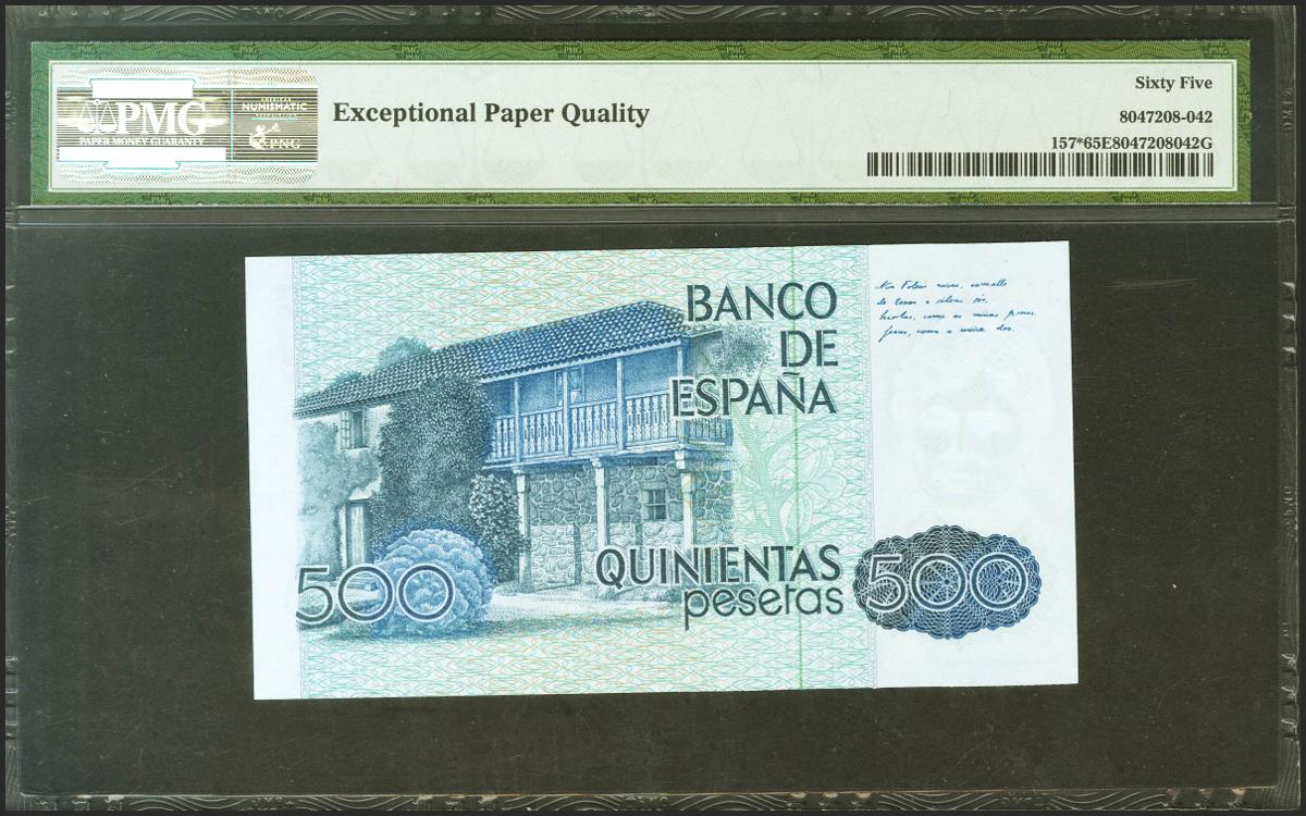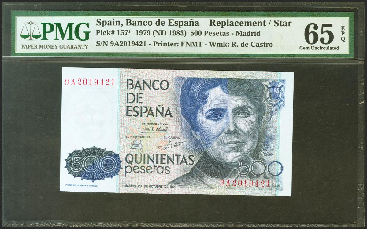 500 Pesetas. 23 de Octubre de 1979. Serie especial 9A. (Edifil 2021: 476b, Pick: 157*). Apresto original. SC. Encapsulado PMG65EPQ.