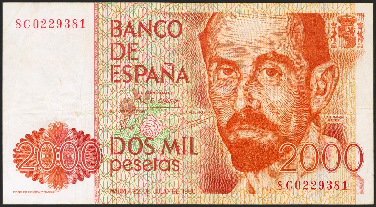 2000 Pesetas. 22 de Julio de 1980. Serie especial 8C. (Edifil 2021: 479c). Extraordinariamente raro, es la primera vez que lo ofrecemos. MBC+.