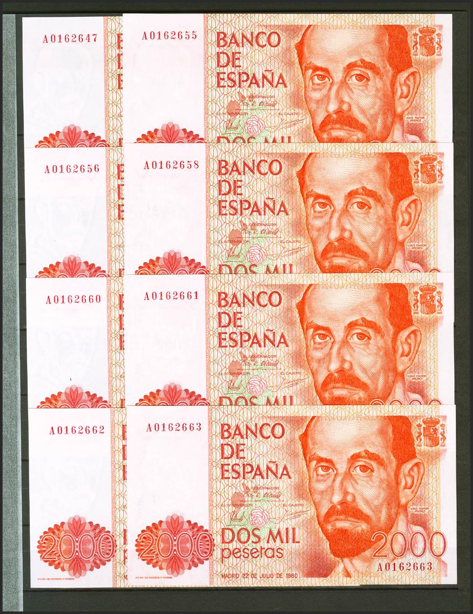 Conjunto de 8 billetes de 2000 Pesetas emitidos el 22 de Julio de 1980 con la serie A y con numeraciones muy próximas, algunas correlativas (Edifil 2021: 479a). SC/SC-.