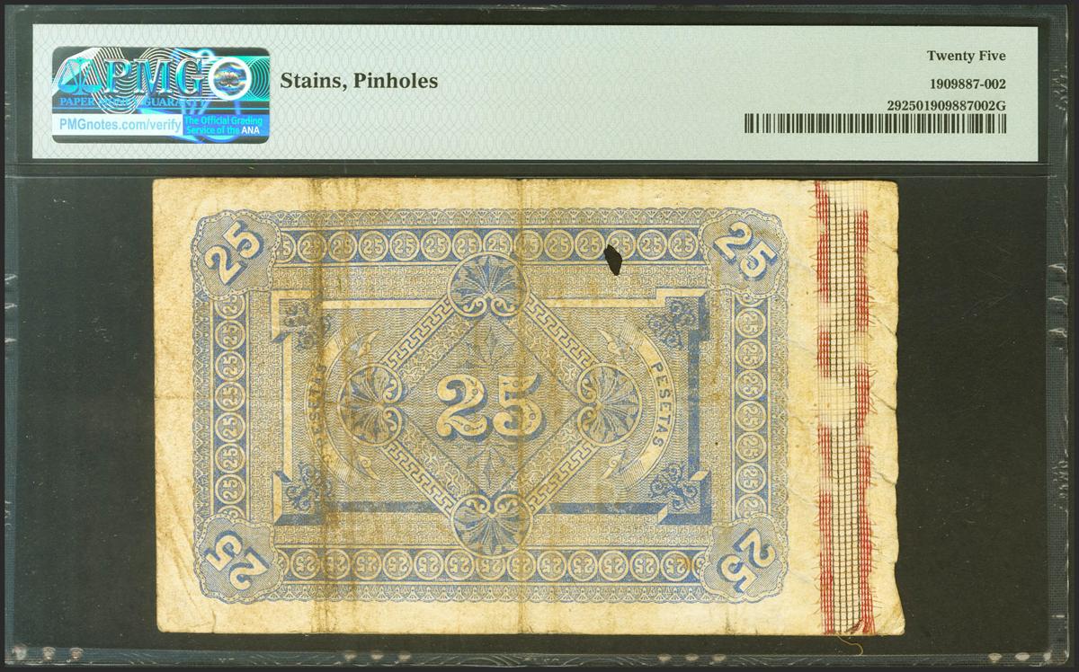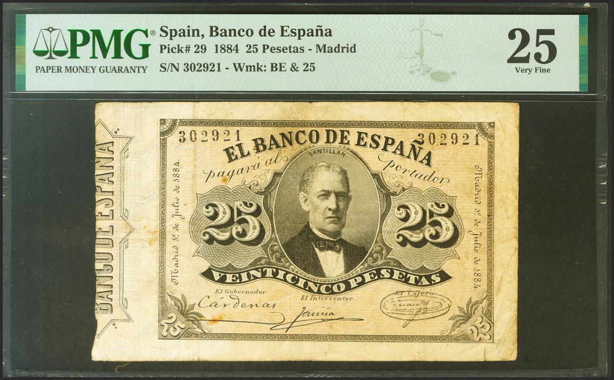 25 Pesetas. 1 de Julio de 1884. Sin serie. (Edifil 2021: 287, Pick: 29). Raro, especialmente sin reparaciones, conservado en su estado original, puntitos de aguja y manchitas sin importancia. MBC. Encapsulado PMG25.