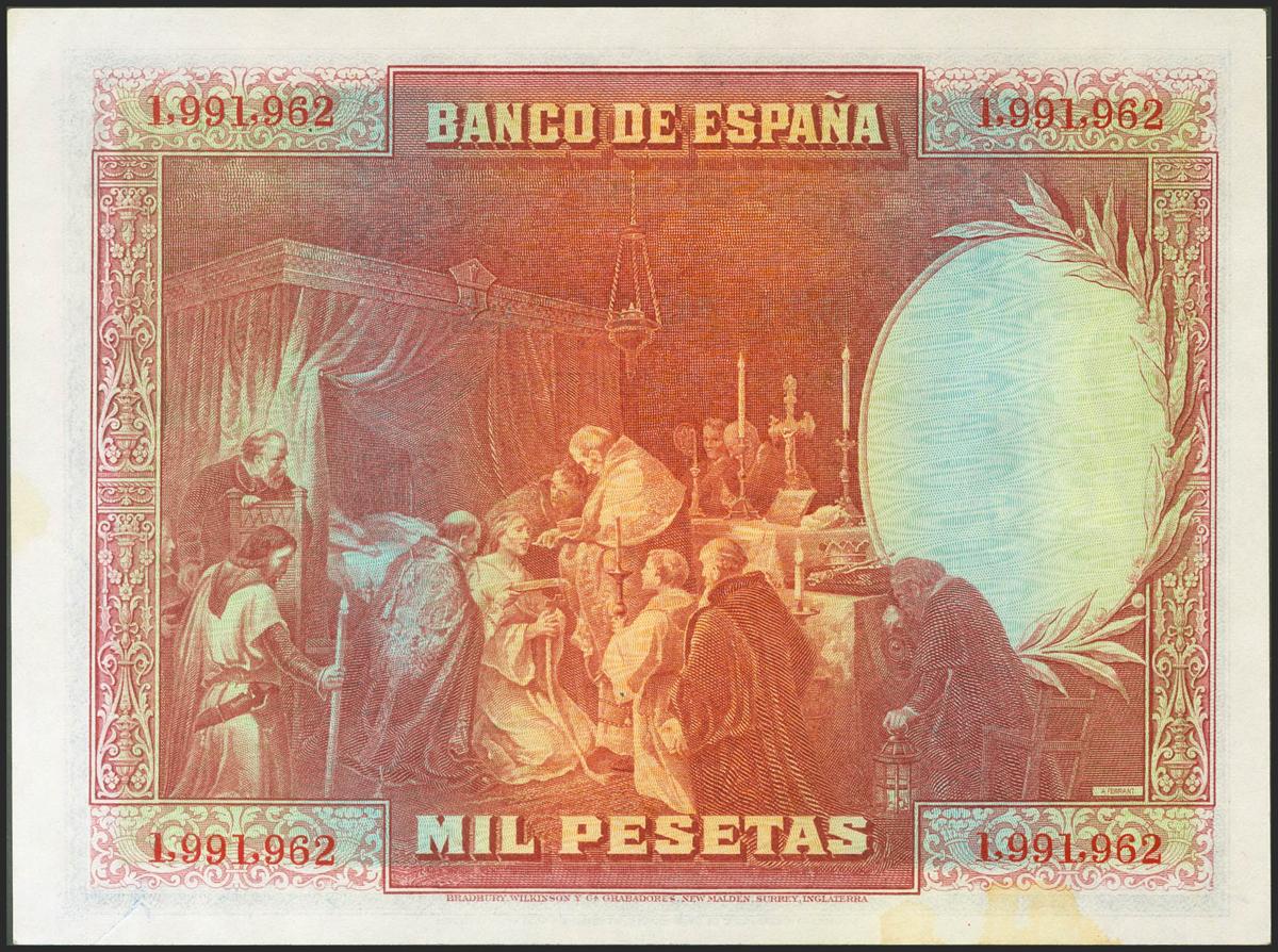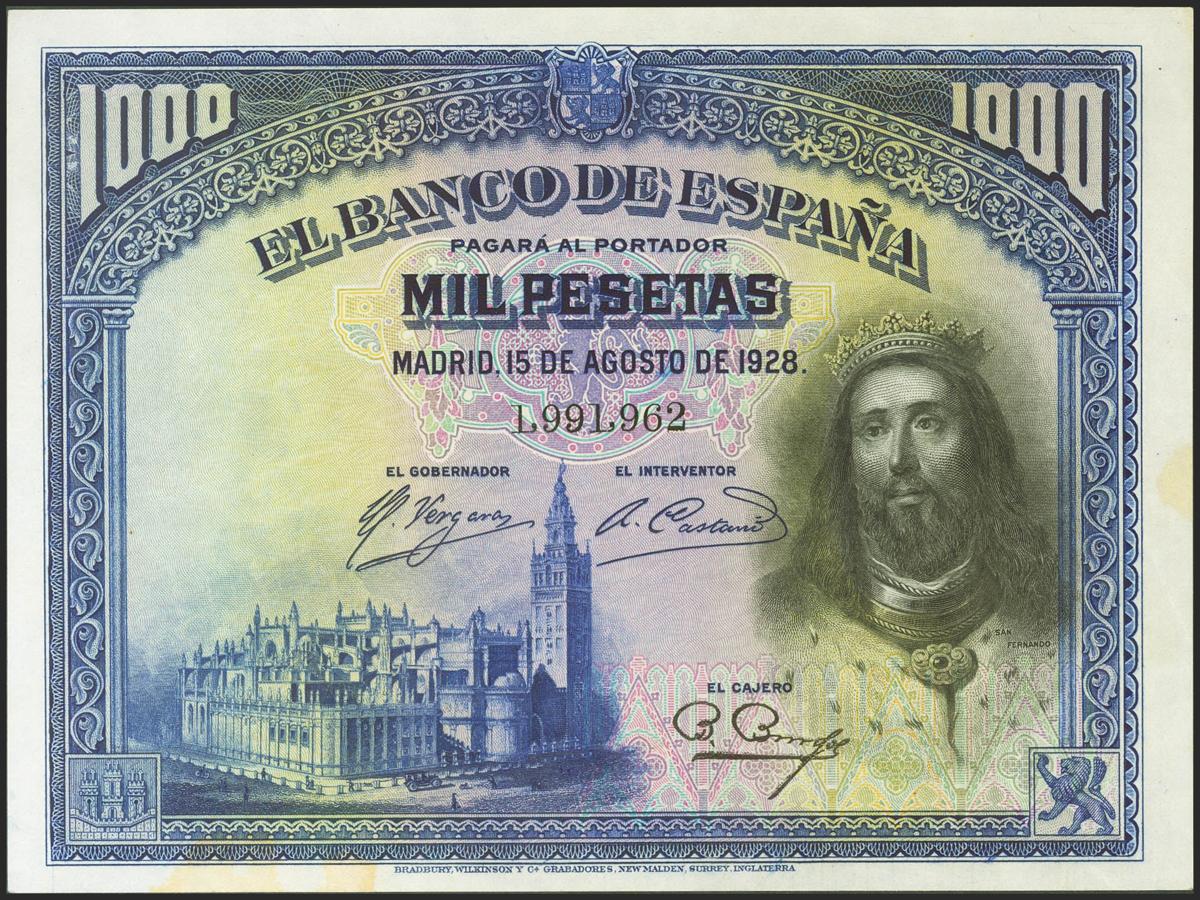 1000 Pesetas. 15 de Agosto de 1928. Sin serie. (Edifil 2021: 357). Manchita en el margen inferior, apresto original. SC-.