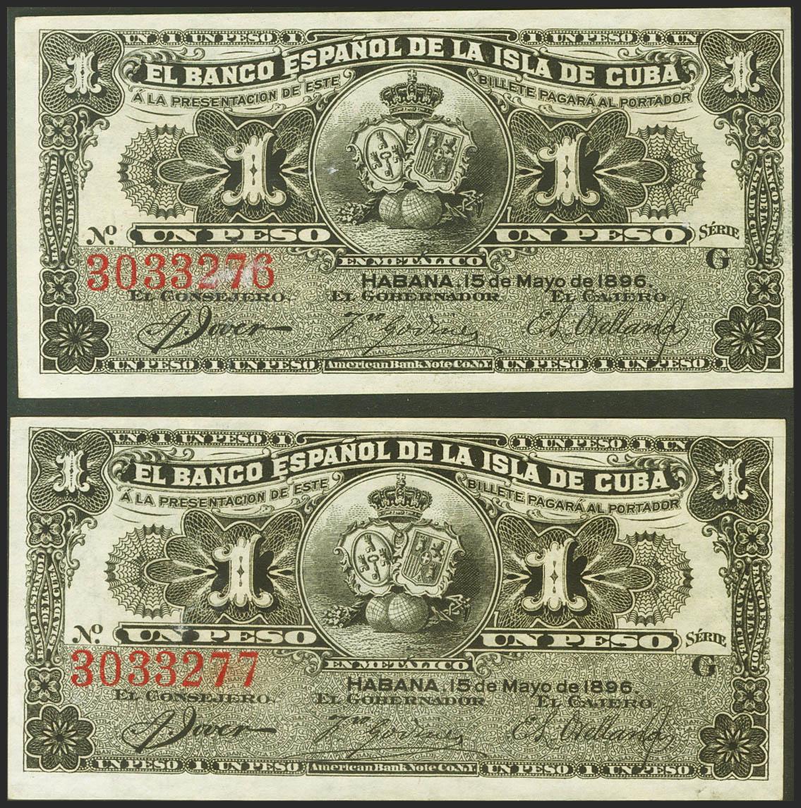 BANCO ESPAÑOL DE LA ISLA DE CUBA. 1 Peso. 15 de Mayo de 1896. Pareja correlativa. Serie G. (Edifil 2021: 71). Apresto original. SC/SC-.
