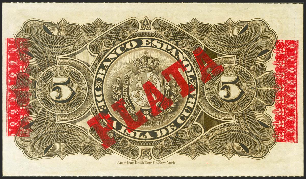 BANCO ESPAÑOL DE LA ISLA DE CUBA. 5 Pesos. 15 de Mayo de 1896. Sobrecarga PLATA, en el reverso. (Edifil 2021: 81). Raro, apresto original. SC-.