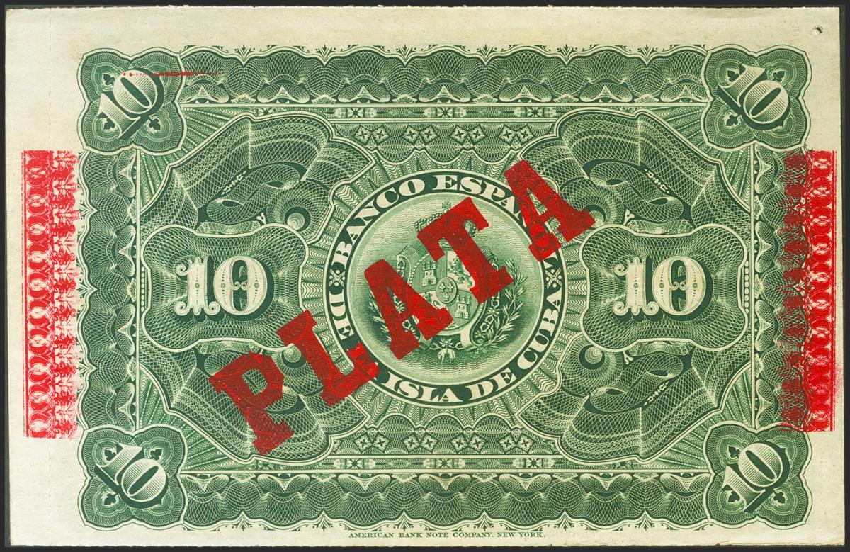 BANCO ESPAÑOL DE LA ISLA DE CUBA. 10 Pesos. 15 de Mayo de 1896. Sobrecarga PLATA, en el reverso. (Edifil 2021: 82). Raro, puntito de grapa. SC-.