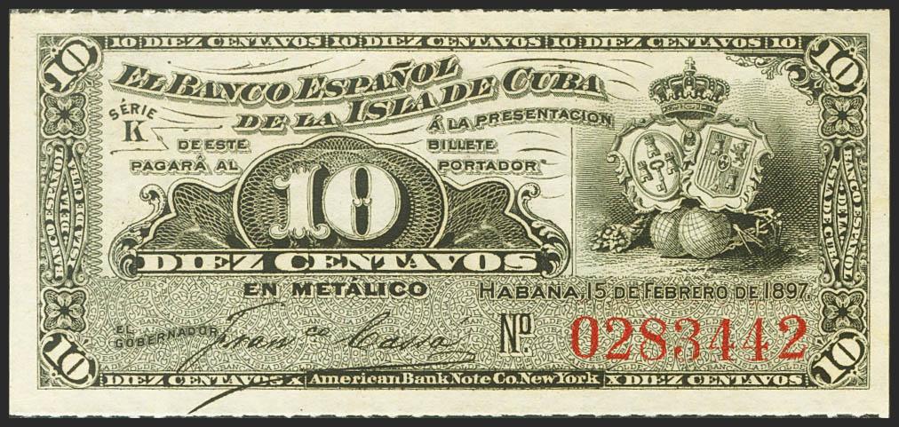 BANCO ESPAÑOL DE LA ISLA DE CUBA. 10 Centavos. 15 de Febrero de 1897. Serie K. (Edifil 2021: 85). Apresto original. SC.