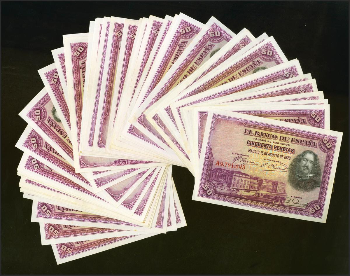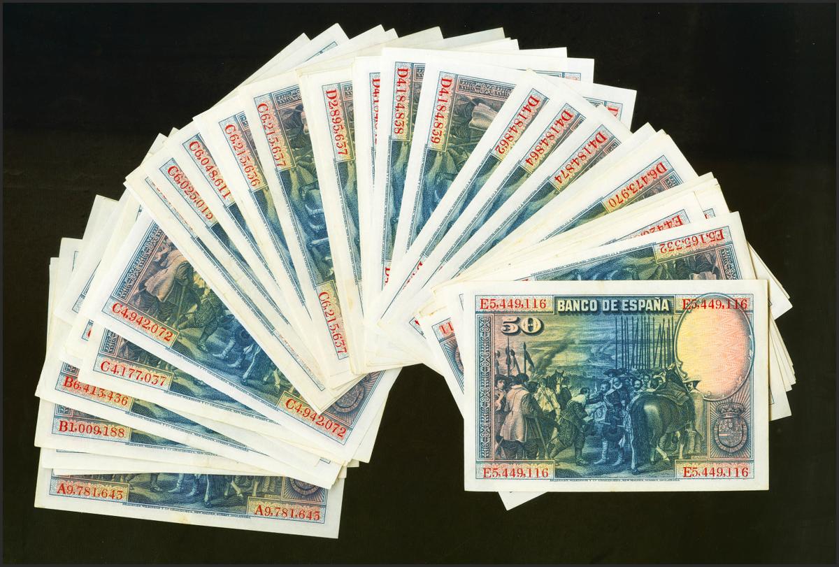 Conjunto de 52 billetes de 50 Pesetas emitidos el 15 de Agosto de 1928 con las series A, B, C, D y E, incluyendo varias parejas con numeraciones correlativas (Edifil 2021: 354). SC-/MBC+. A EXAMINAR.