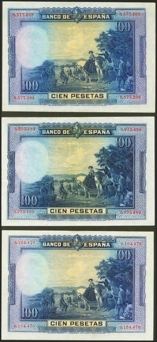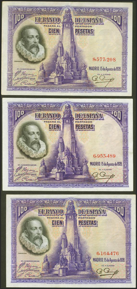 Conjunto de 3 billetes de 100 Pesetas emitidos el 15 de Agosto de 1928, con la serie A (Edifil 2021: 355, 355a), conservan su apresto original. EBC+. A EXAMINAR.