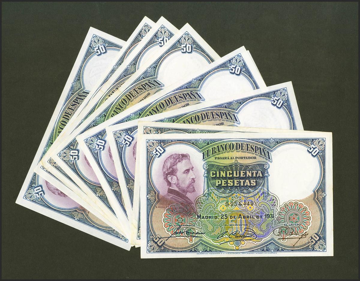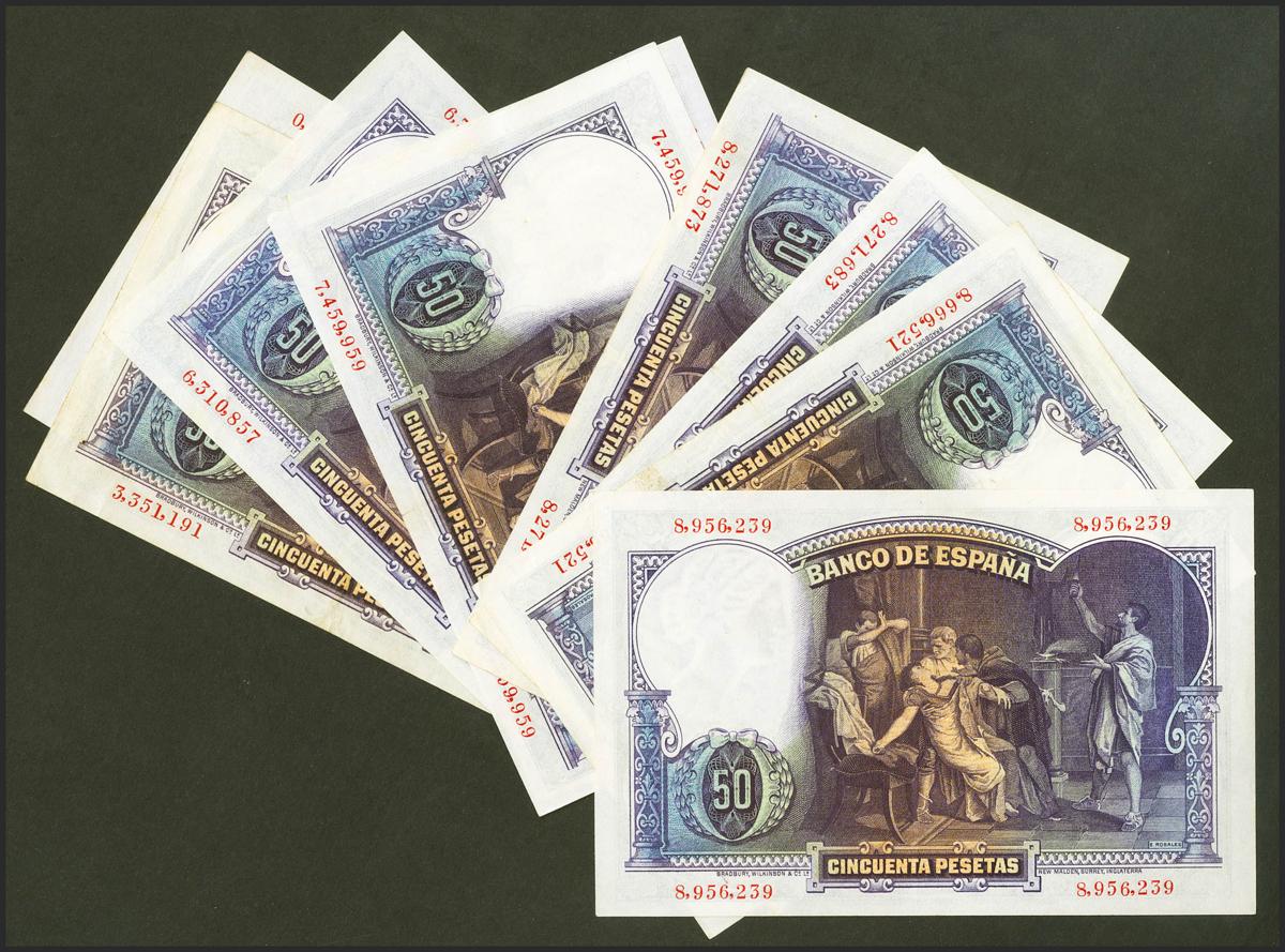 Conjunto de 9 billetes de 50 Pesetas emitidos el 25 de Abril de 1931 sin serie, incluyendo un trío con numeraciones correlativas (Edifil 2021: 359). EBC/MBC. A EXAMINAR.
