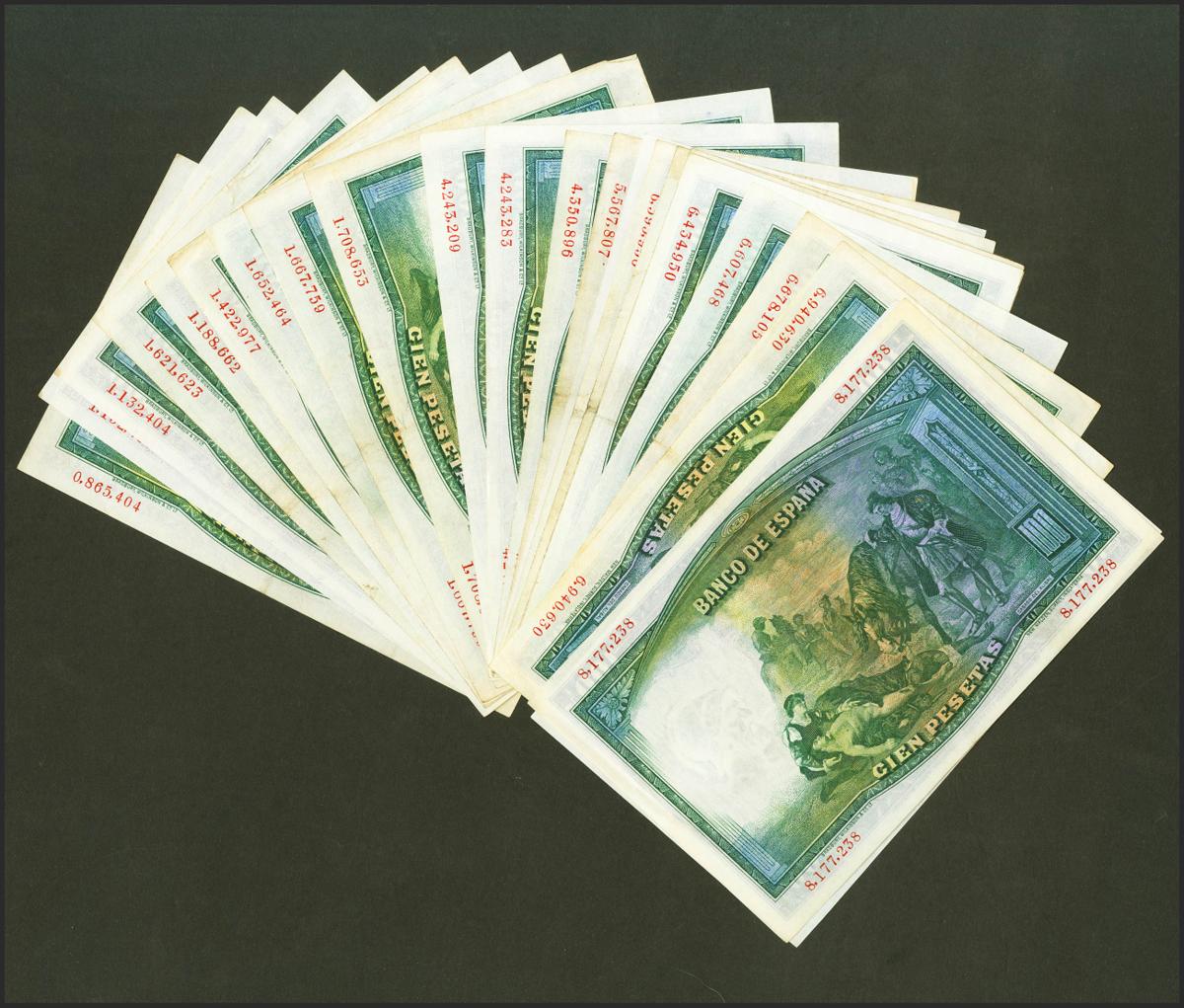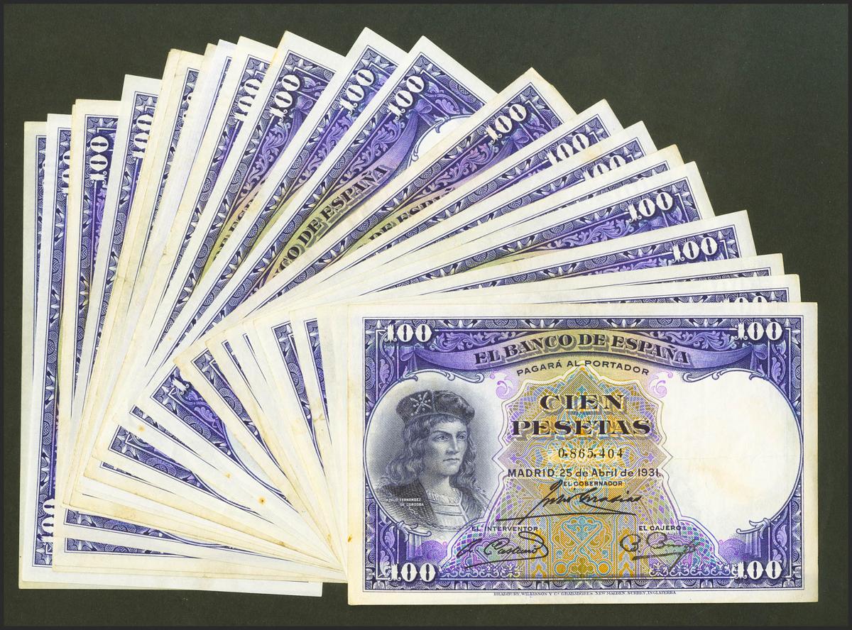 Conjunto de 24 billetes de 100 Pesetas emitidos el 25 de Abril de 1931, sin serie (Edifil 2021: 360). EBC+/MBC. A EXAMINAR.