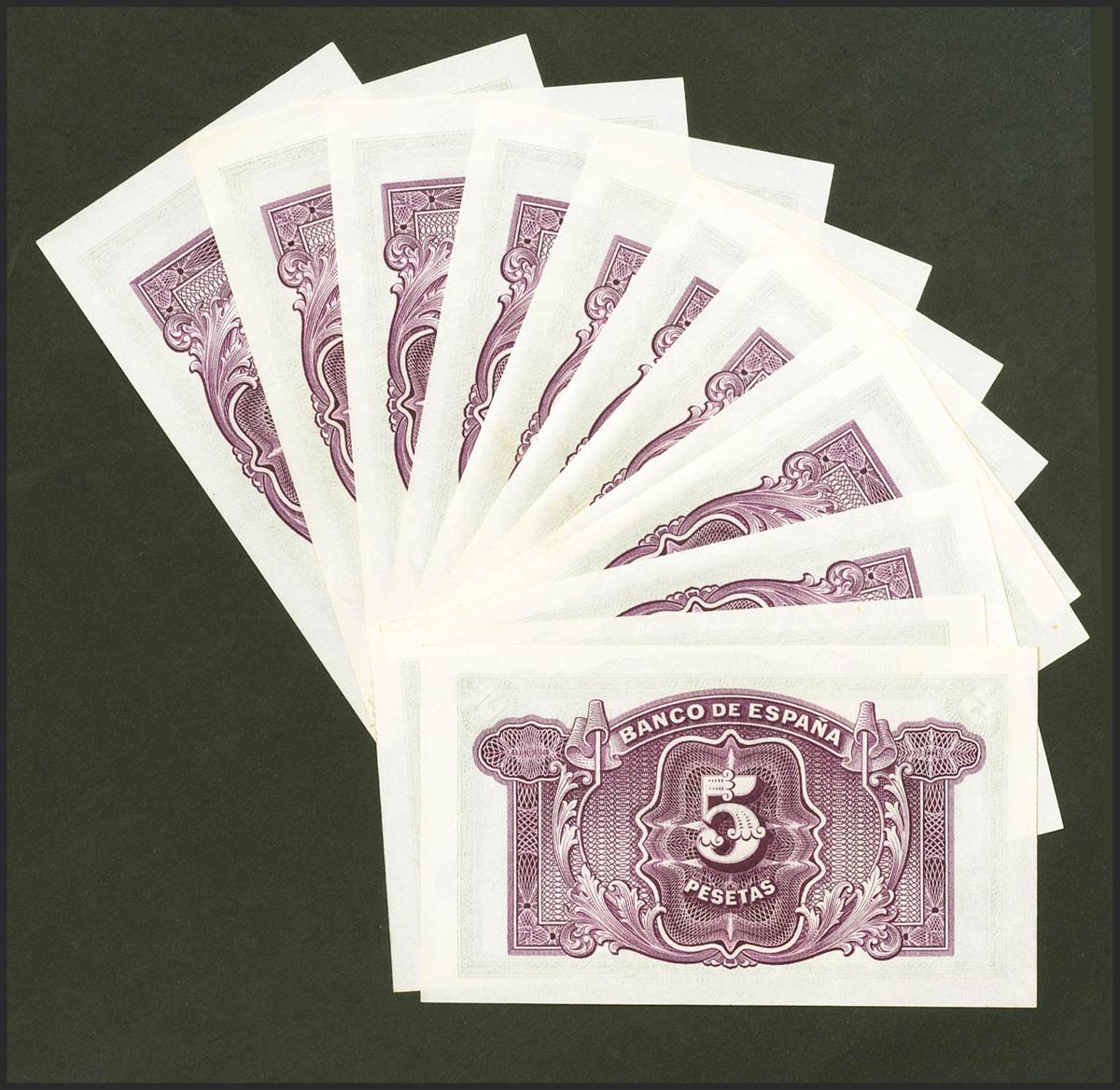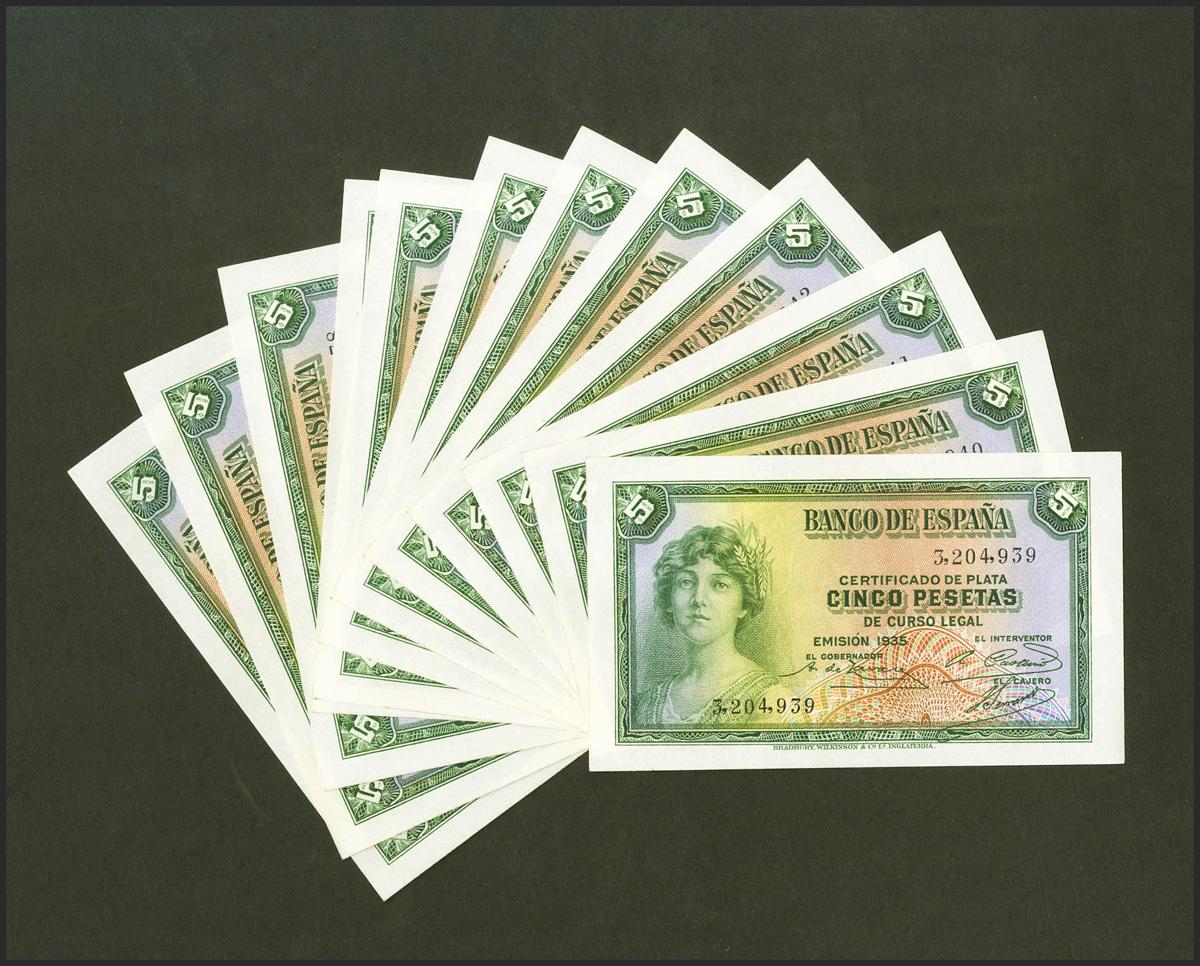 Conjunto de 12 billetes de 5 Pesetas emitidos en 1935 sin serie, con numeraciones muy próximas, alguna de ellas correlativas (Edifil 2021: 363), conservan todo su apresto original. SC/SC-. A EXAMINAR.