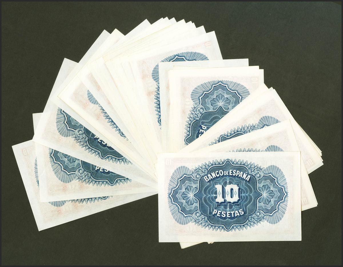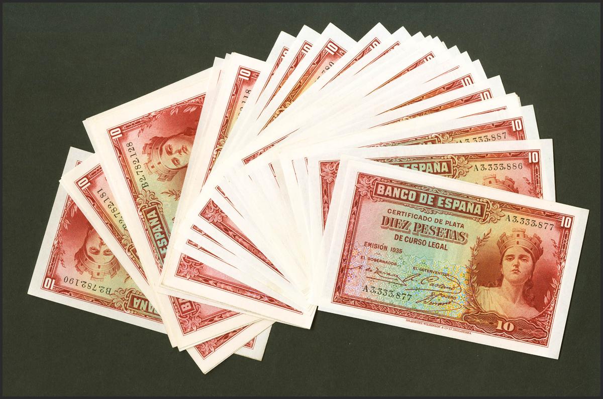 Conjunto de 38 billetes de 10 Pesetas emitidos en 1935 con las series A y B, con numeraciones muy próximas y muchas de ellas correlativas (Edifil 2021: 364a), conservan todo su apresto original. SC/SC-. A EXAMINAR.