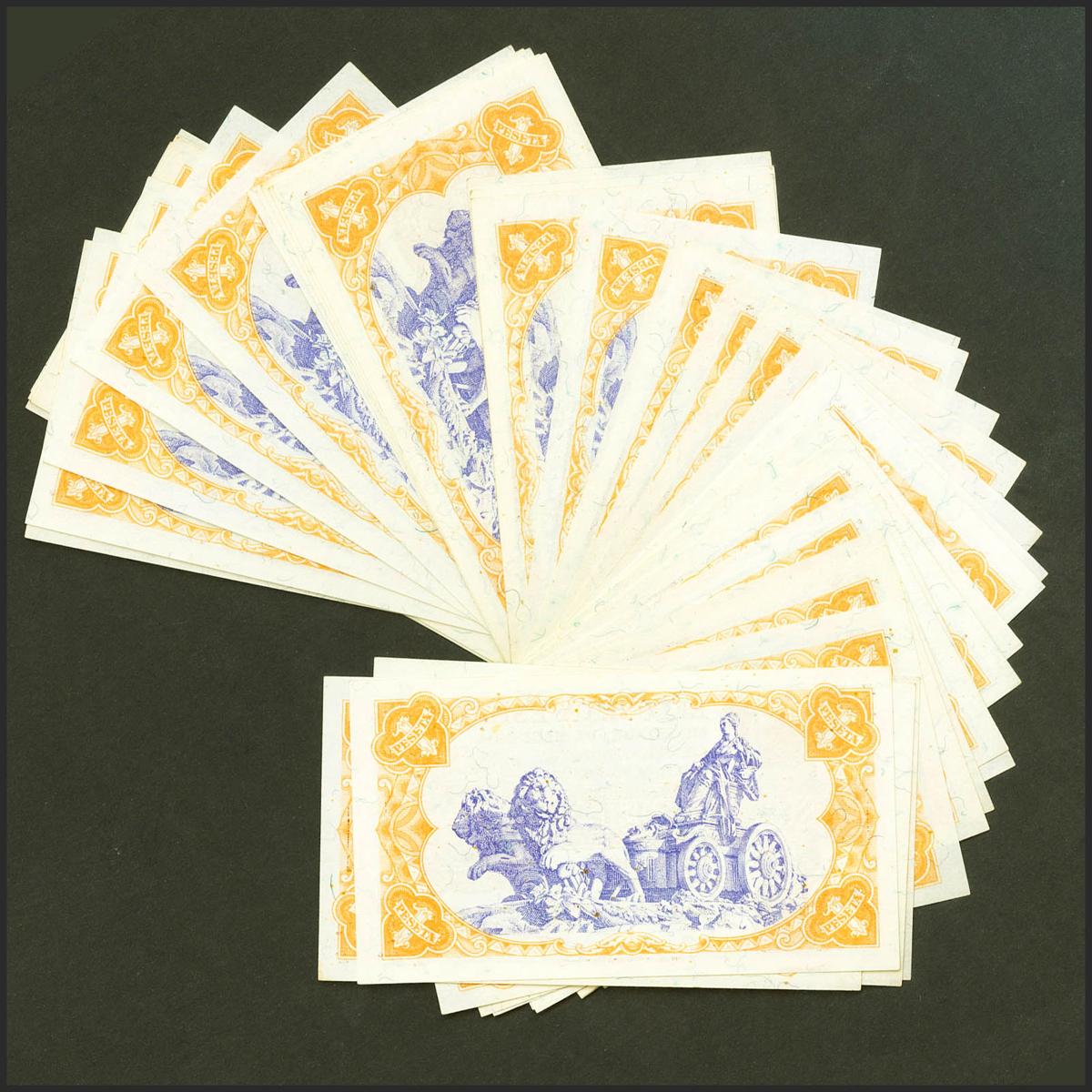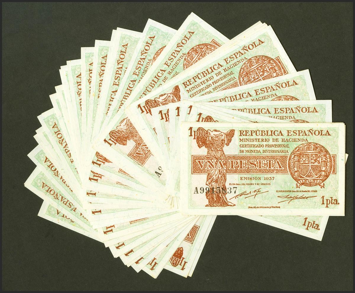 Conjunto de 40 billetes de 1 Peseta emitidos en 1937 con la serie A , con numeraciones muy próximas, alguna de ellas correlativas (Edifil 2021: 392), conservan todo su apresto original. SC/EBC+. A EXAMINAR.