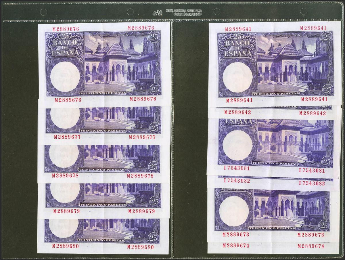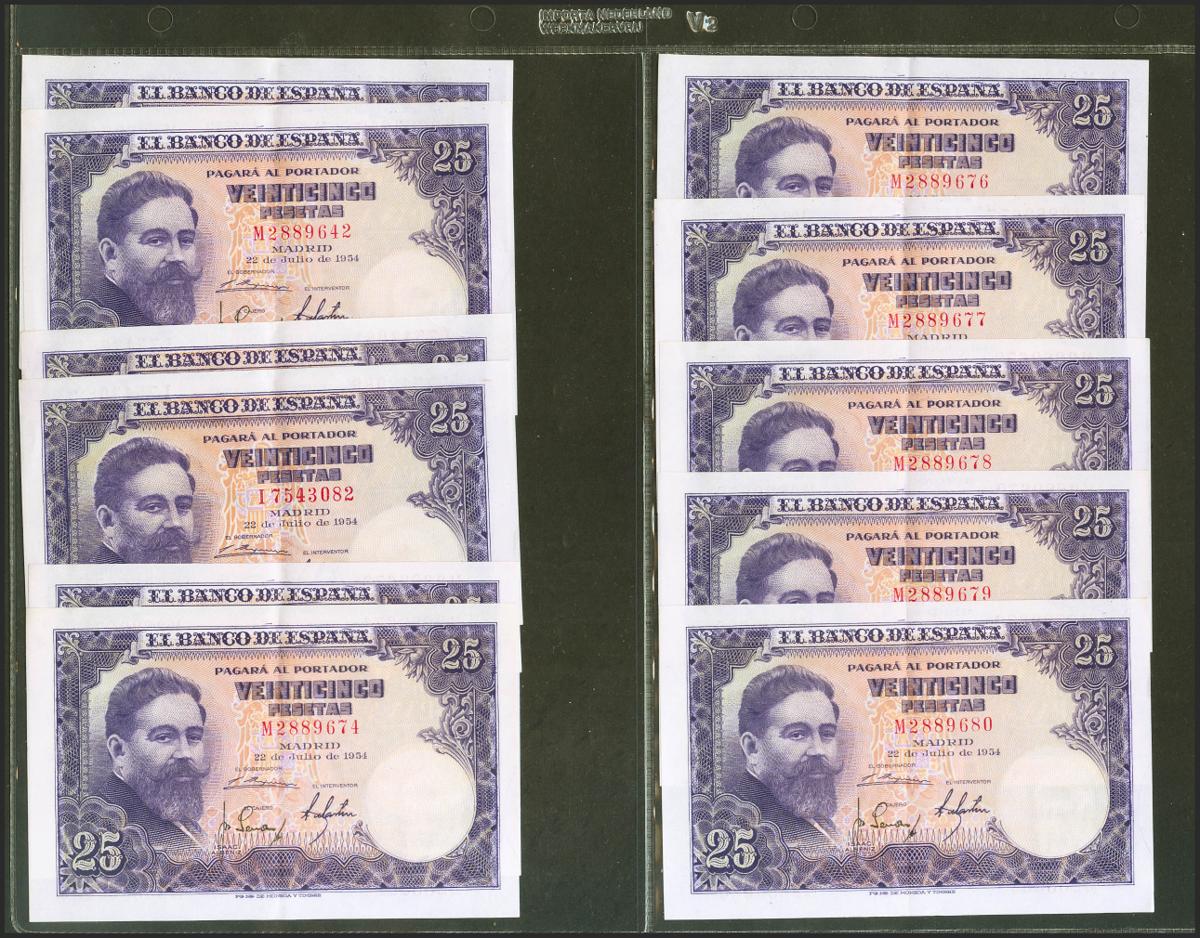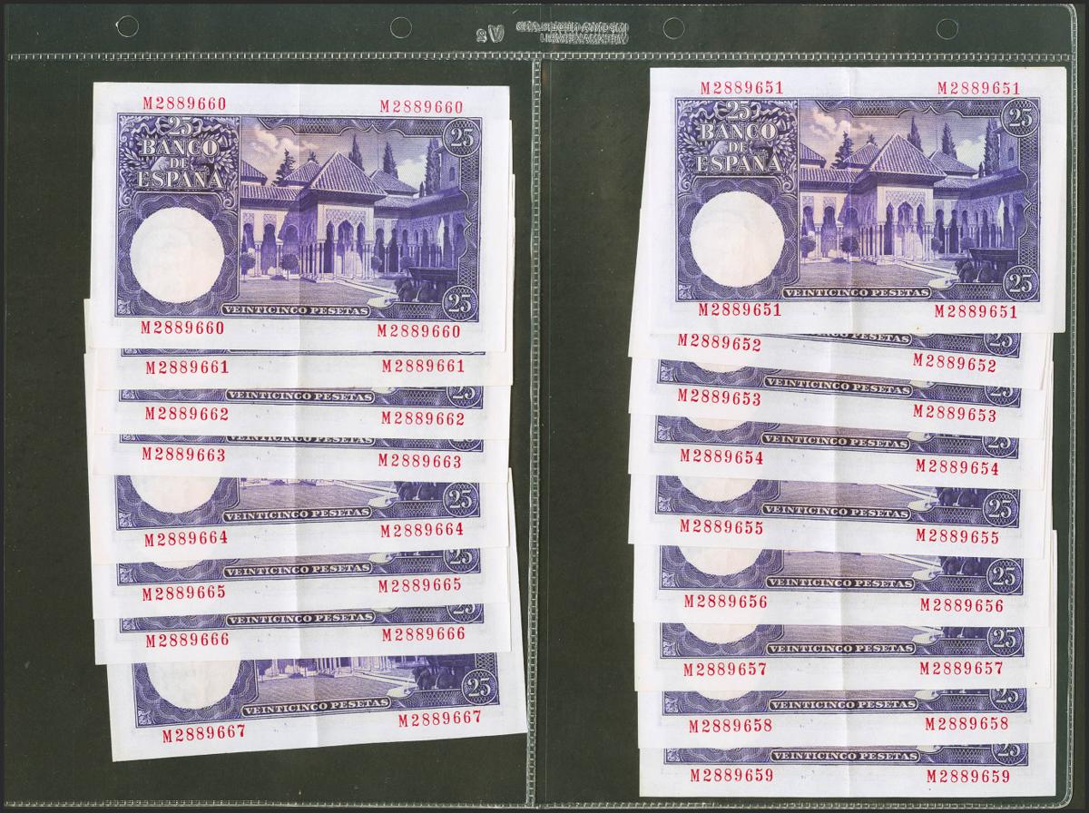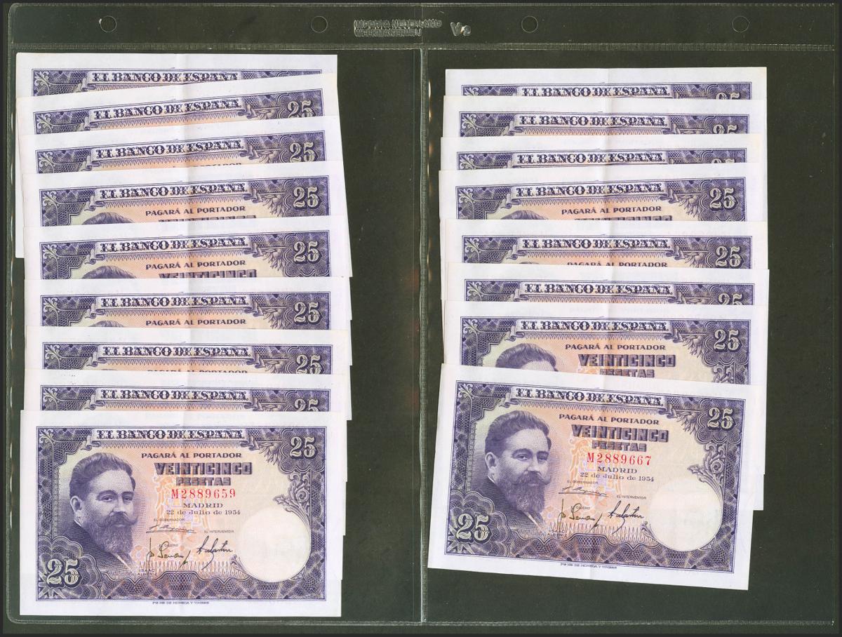 Conjunto de 28 billetes de 25 Pesetas emitidos el 22 de Julio de 1954 con la serie M y con numeraciones próximas y en su mayoría correlativas (Edifil 2021: 467a), conservando la gran parte de su apresto original. EBC+.