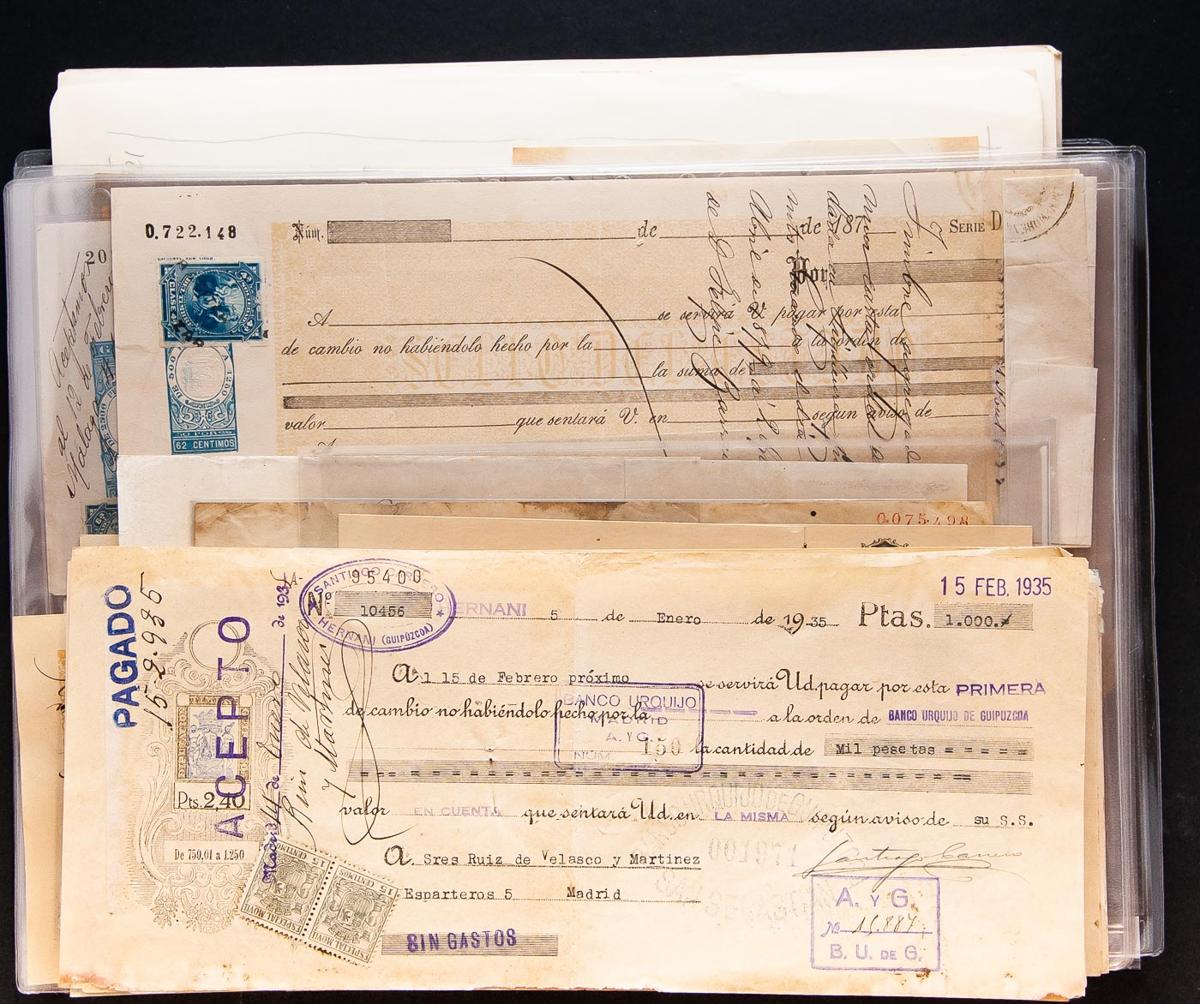 Interesante conjunto de Letras de Cambio principalmente de las primeras décadas del siglo XX tasadas con los diferentes Timbres de Estado Fiscales correspondientes (Giro, Móvil, Facturas y Recibos, Foralidades, etc), algunas de ellas libradas en el extranjero y cobradas en bancos españoles con las tasas de cada país, incluye un "PROTESTO" por impago y algún documento de cambio sin utilizar. A EXAMINAR.