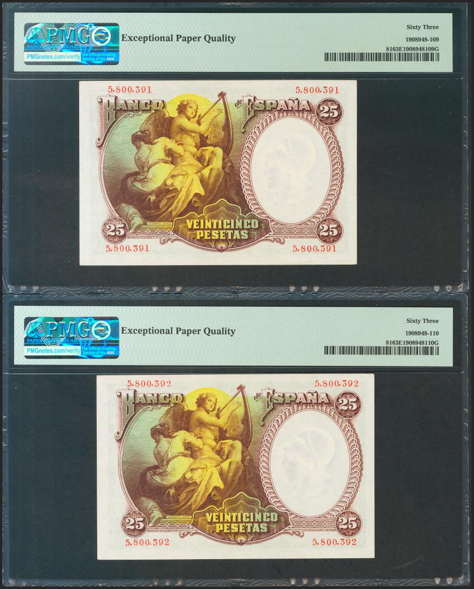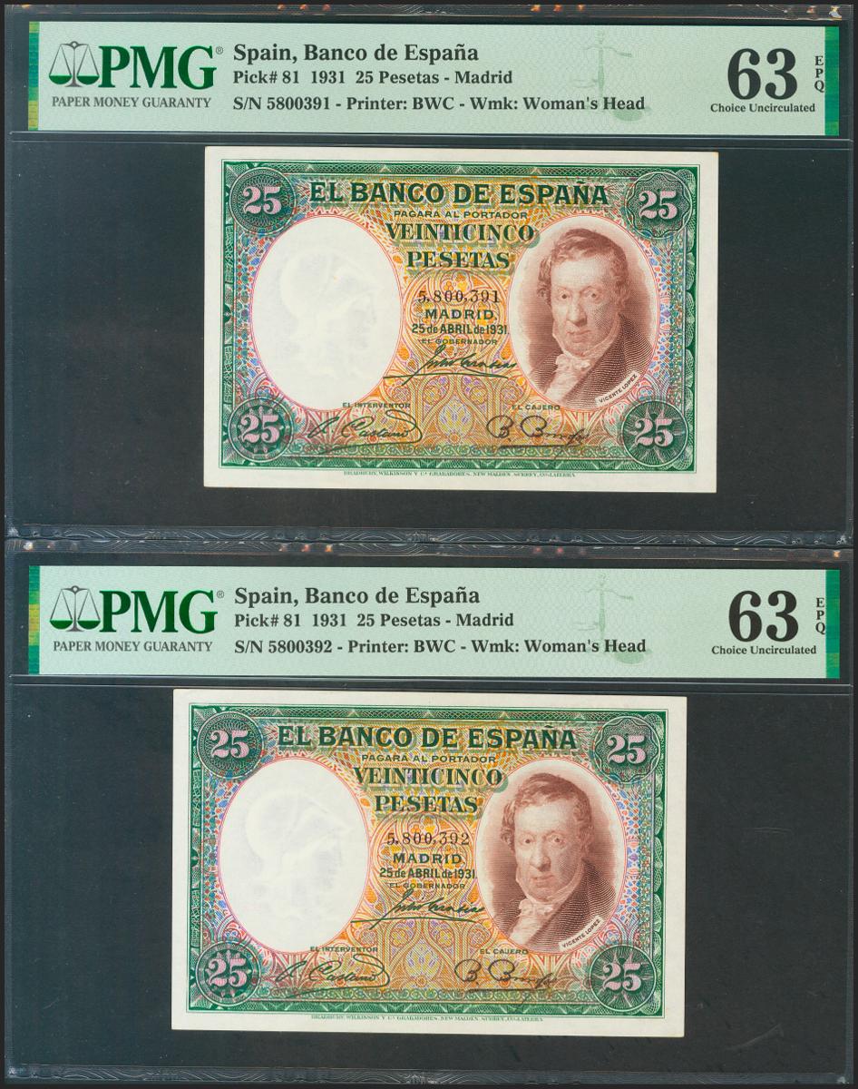 25 Pesetas. 25 de Abril de 1931. Pareja correlativa. Sin serie. (Edifil 2021: 358, Pick: 81). Inusual en esta calidad y con apresto original. SC. Encapsulado PMG63EPQ, ambos.