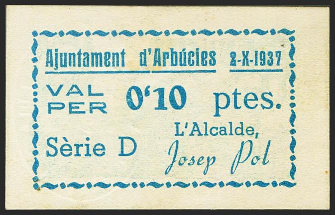 ARBUCIES (GERONA). 10 Céntimos. 2 de Octubre de 1937. Serie D. (González: 6325). EBC.