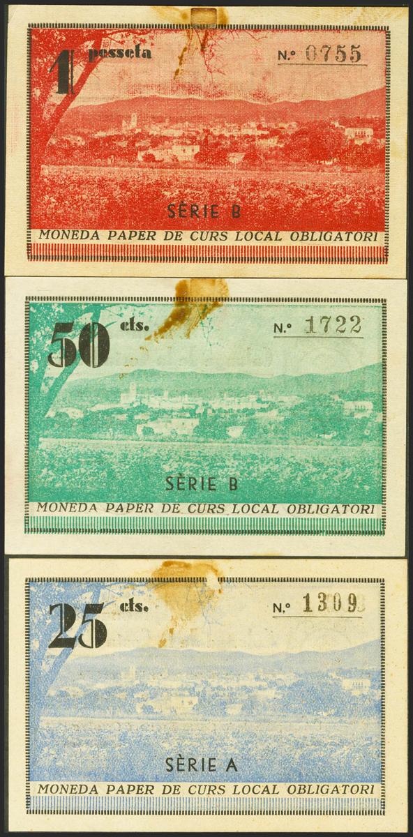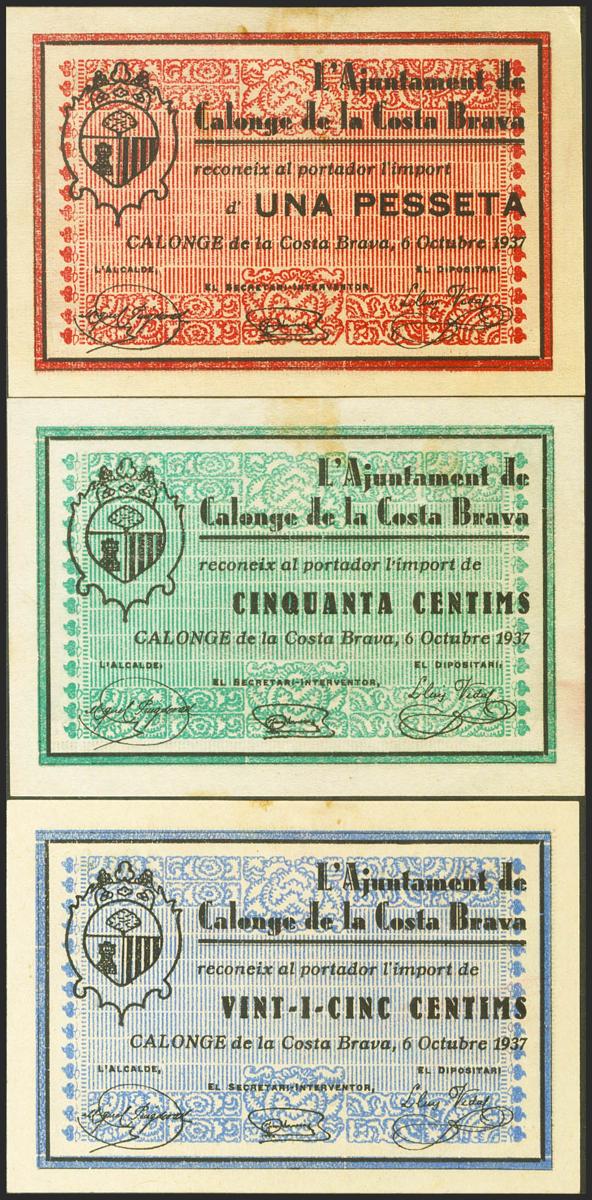 CALONGE DE LA COSTA BRAVA (GERONA). 25 Céntimos, 50 Céntimos y 1 Peseta. 6 de Octubre de 1937. Series A y B(2), respectivamente. (González: 7307/09). Inusual serie completa. MBC+.