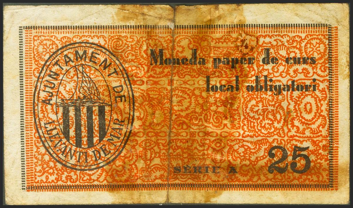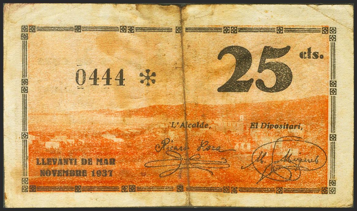 LLEVANTI DE MAR (BARCELONA). 25 Céntimos. Noviembre 1937. Serie A. (González: 8398). RC.