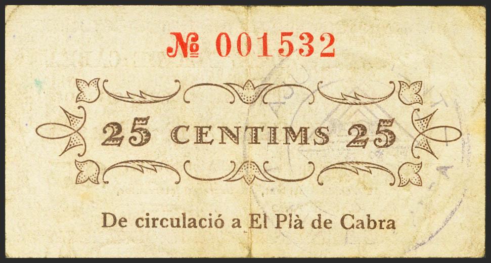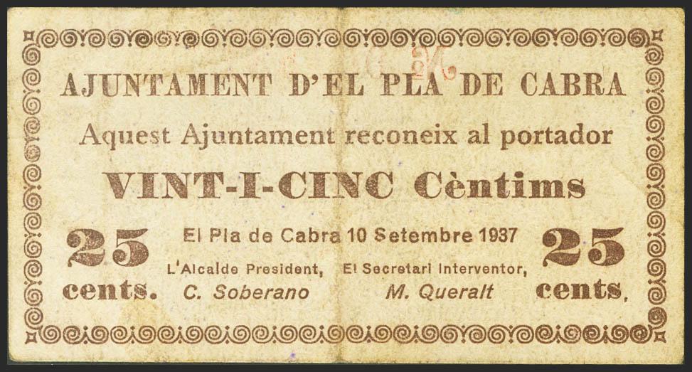 PLA DE CABRA (TARRAGONA). 25 Céntimos. 10 de Septiembre de 1937. (González: 9249). Raro. MBC.