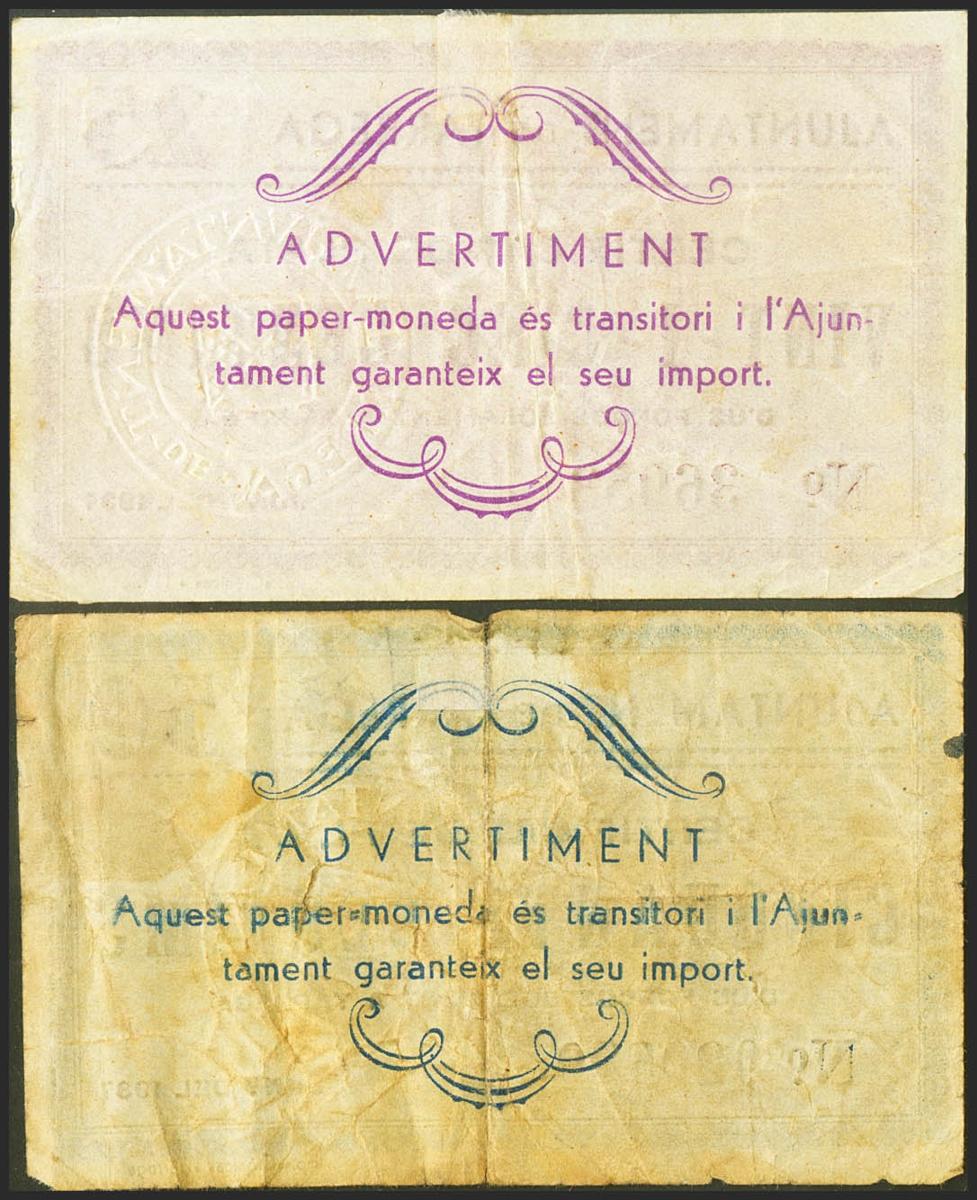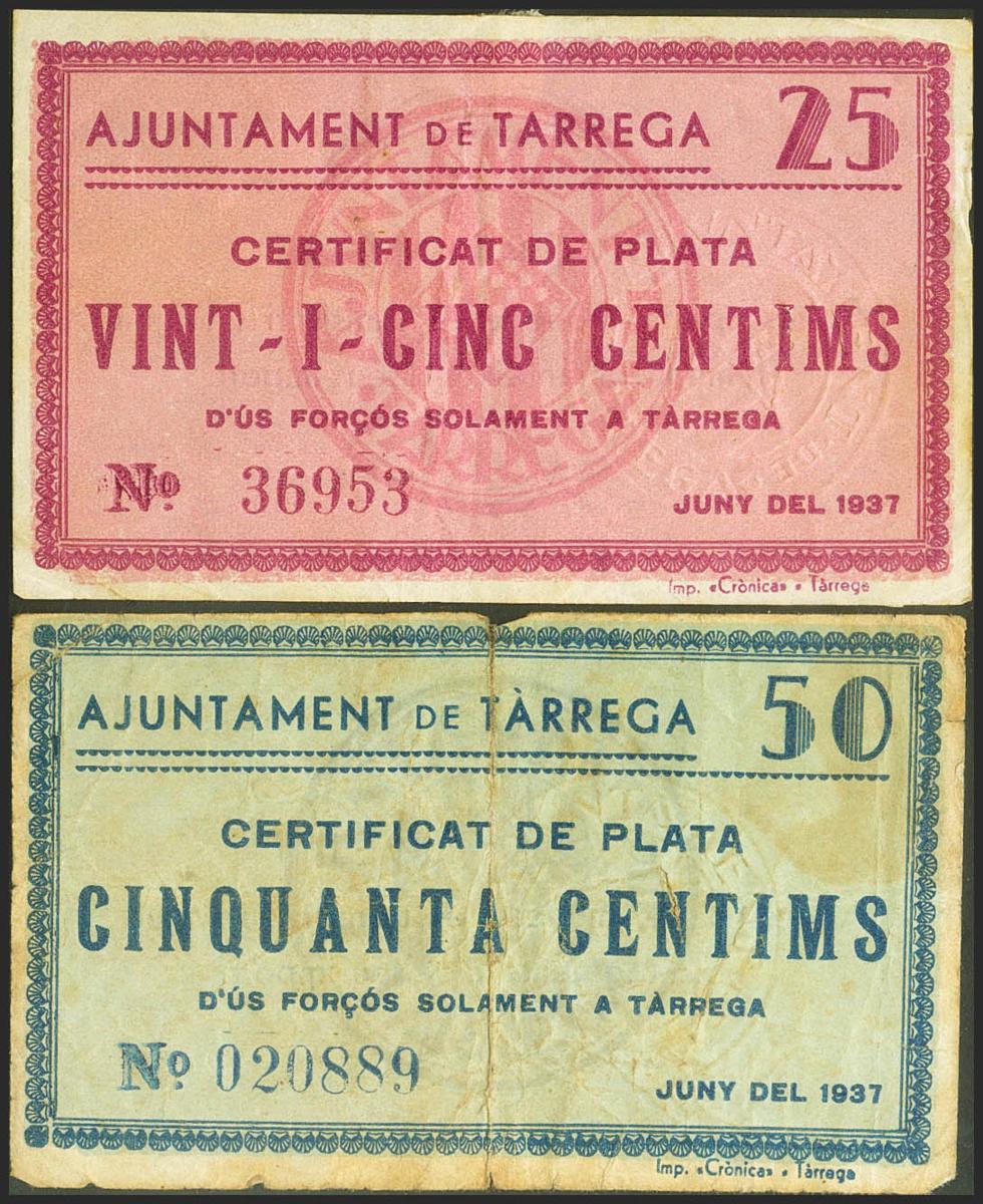 TARREGA (LERIDA). 25 Céntimos y 50 Céntimos. Junio 1937. (González: 10101/02). Serie completa. MBC/BC.