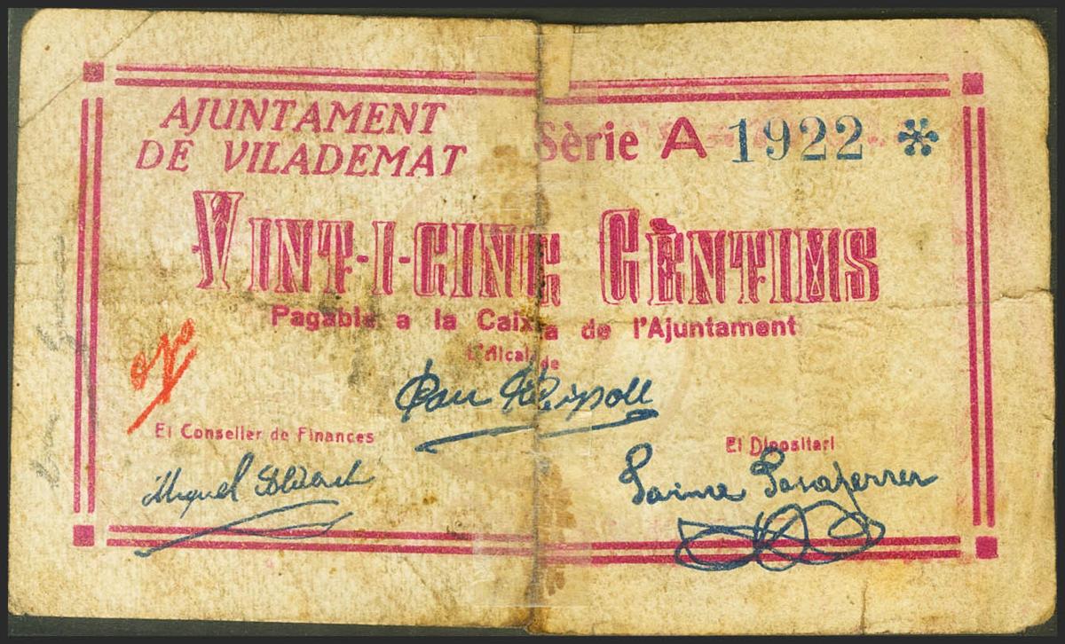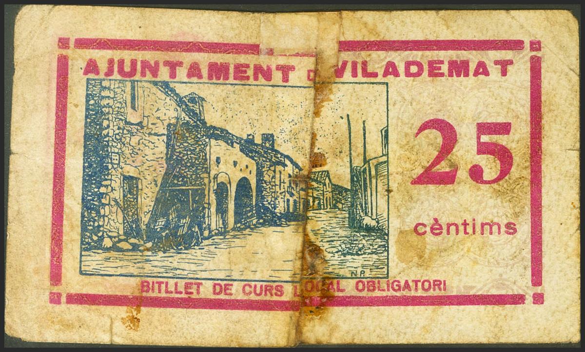 VILADEMAT (GERONA). 25 Céntimos. (1937ca). Serie A. (González: 10698). Inusual, reconstruido con cinta adhesiva. RC.