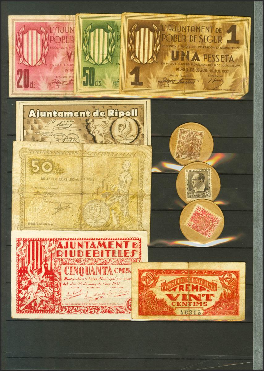 Conjunto de 18 billetes de la Guerra Civil, un vale de la localidad de Manresa y 3 modenas de papel cartón, en diversas calidades. A EXAMINAR.