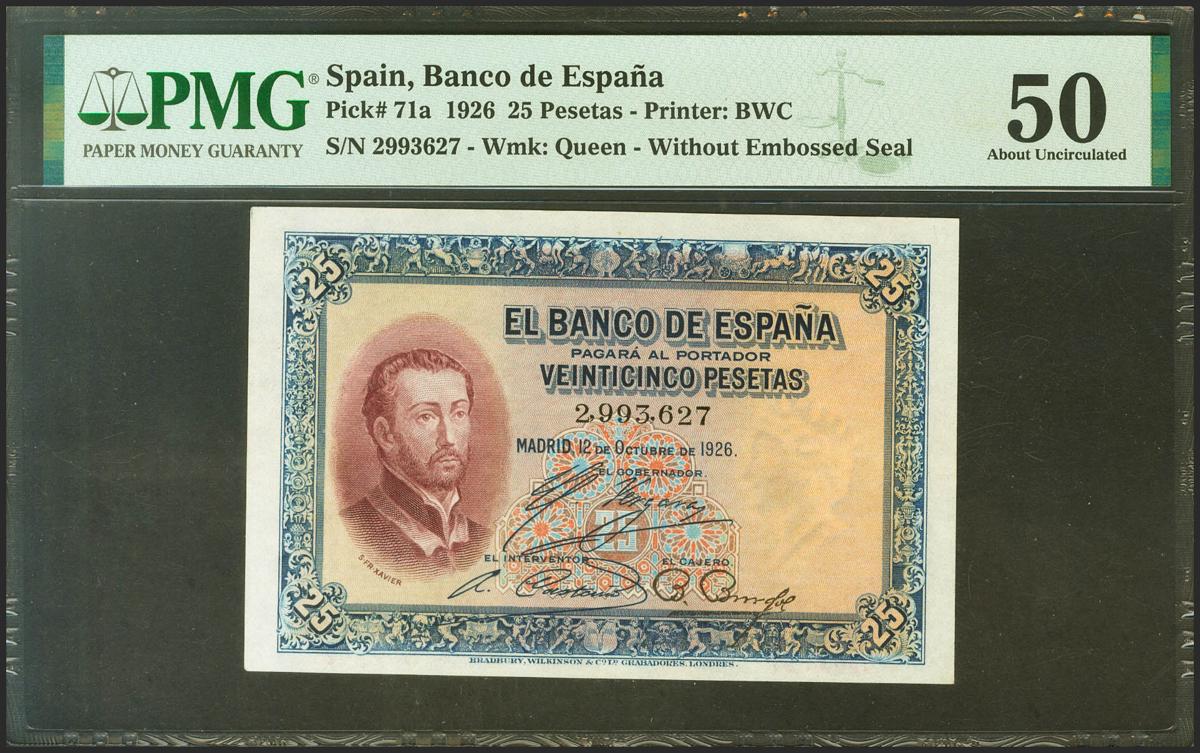25 Pesetas. 12 de Octubre de 1926. Sin serie. (Edifil 2021: 325, Pick: 71a). Inusual en esta calidad. EBC. Encapsulado PMG50.