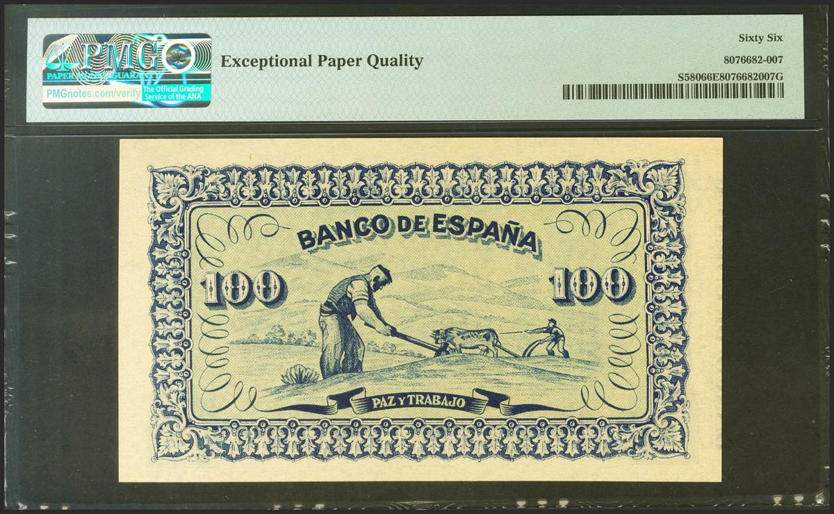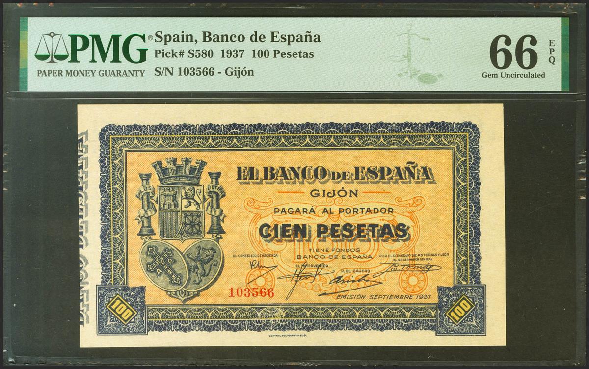 100 Pesetas. Septiembre 1937. Sucursal de Gijón. Sin serie. (Edifil 2021: 399, Pick: S580). Inusual en esta excepcional calidad, apresto original. SC. Encapsulado PMG66EPQ.